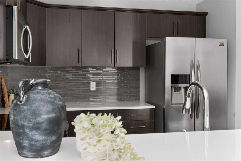 Lovingly maintained by its original owners, this beautifully appointed end-unit townhome offers 2 bedrooms, 2.5 bathrooms, and a double attached garage with paved rear lane access, all with no condo fees. Step inside to beautiful hardwood floors, large windows that flood the space with natural light, and a thoughtfully designed main level finished with quartz countertops, stainless steel appliances, tiled entry and mudroom, and Hunter Douglas blinds. Upstairs, a spacious bonus room creates flexible living space, complemented by two generous bedrooms. Enjoy the large rear balcony for outdoor living, plus the future potential of an unfinished basement. Furnace and ducts have been recently maintained for added peace of mind. Ideally situated near environmental reserves and walking paths, with quick access to major highways and the airport, this home offers both everyday convenience and room to grow.