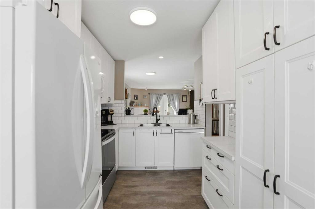 WOW! Take a look at this incredible end-unit duplex in the West Point Villas II complex, in the sought-after neighbourhood of Fairways, NW Airdrie! Boasting 1,881 square feet of fully developed living space, this home features 3 bedrooms + den, and 3 full bathrooms! Noteworthy upgrades/updates include a tastefully renovated kitchen (with bright white cabinetry, laminate countertops, and newer appliances), a newly custom-built glass-enclosed walk-in shower in the primary ensuite, central air conditioning, central vacuum system, cozy natural gas fireplace in the living room, and upgraded flooring throughout (hardwood, linoleum, and plush carpet). The furnace has been recently serviced and new smoke/CO detectors have been installed for added peace of mind. Additional highlights include a large, private, fully-fenced, south-facing backyard with a spacious composite deck and beautiful perennial garden, an insulated single attached garage with storage cabinetry, and a front driveway for extra parking. Don’t miss this rare opportunity—call today!