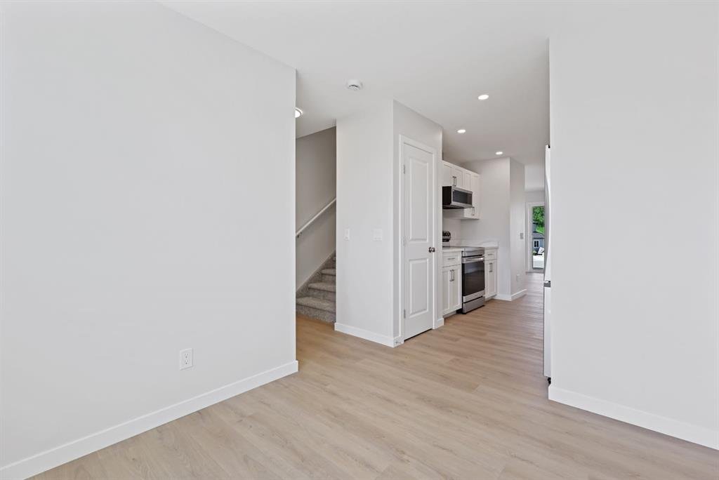 The main level includes an attached garage, utility room, and direct access to the backyard — offering both practicality and convenience. Upstairs, the bright and spacious main floor boasts an open dining area, cozy living room, and a modern kitchen complete with white soft-close cabinets, white quartz countertops, a pantry, and vinyl plank flooring in a warm, neutral tone. This level also includes a 2-piece bathroom and access to your private rear deck — ideal for relaxing or entertaining.