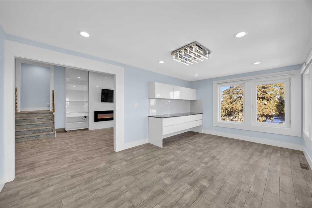 An open-concept kitchen highlights the main floor, featuring oversized cabinets, stainless steel appliances, granite counters, an eating bar, and a pantry. Adjacent to the kitchen is a living room with a second 72” electric fireplace, built-in wall units, and a custom tiled feature wall. The formal dining area comfortably fits a large family table and includes a built-in bar.