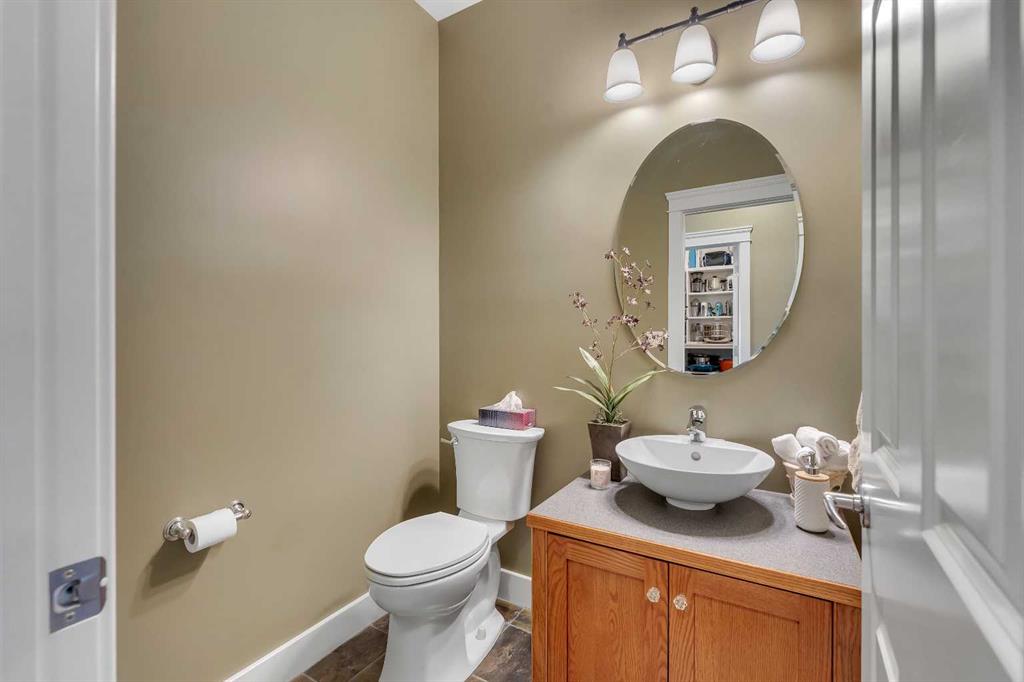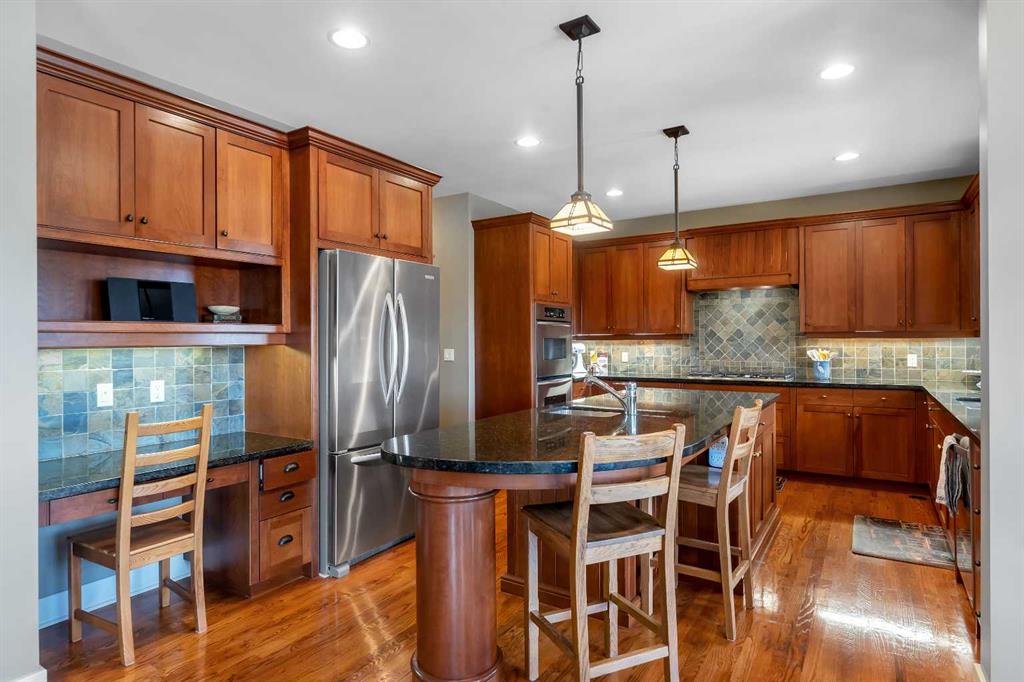 From the street, the stone and timber exterior and arched garage doors set the tone. The oversized triple attached garage offers room for vehicles, gear, and everything that comes with an active Alberta family.