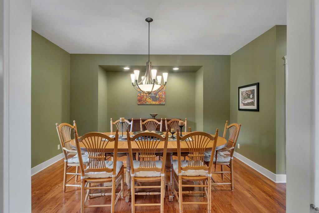 Inside, over 4,100 sq ft unfolds across three levels with the kind of warmth that’s hard to manufacture, rich hardwood floors, custom cherry cabinetry, and natural light that moves through the home all day. The main level flows from a formal dining room that seats twelve comfortably to a chef’s kitchen outfitted with a gas cooktop, double wall ovens, granite countertops, and a built-in desk nook that keeps family life organized. The living room, anchored by a stone fireplace, opens directly to the deck and that unobstructed pond view, a backdrop that genuinely never gets old. A dedicated home office and main floor laundry round out a level designed for how real families live.