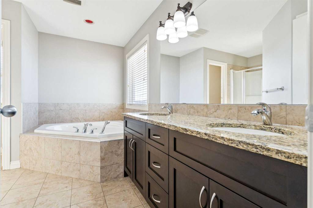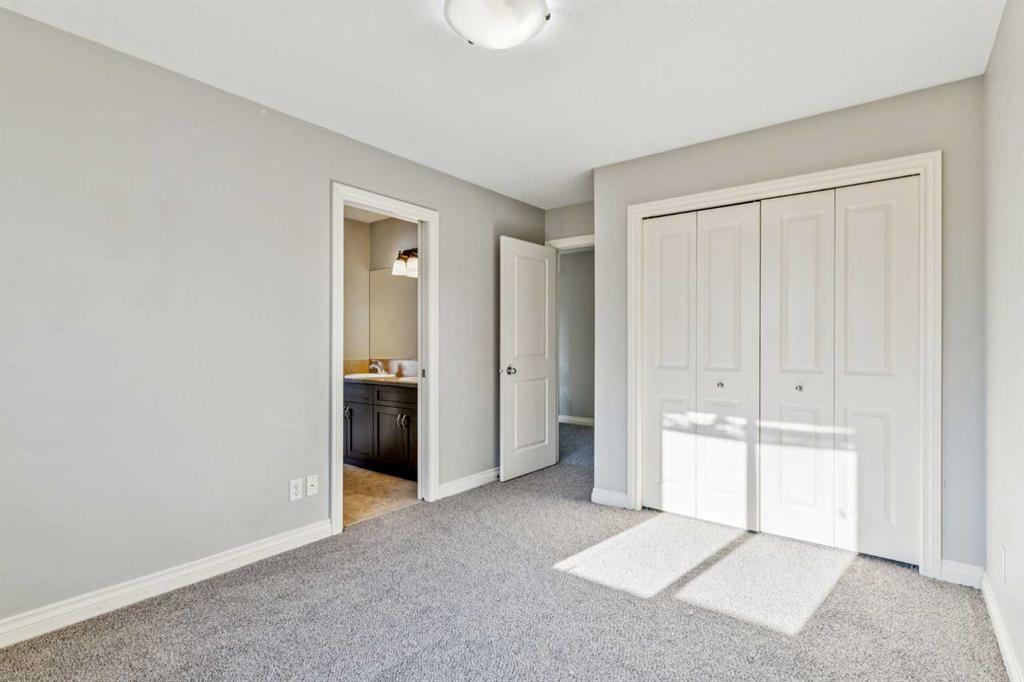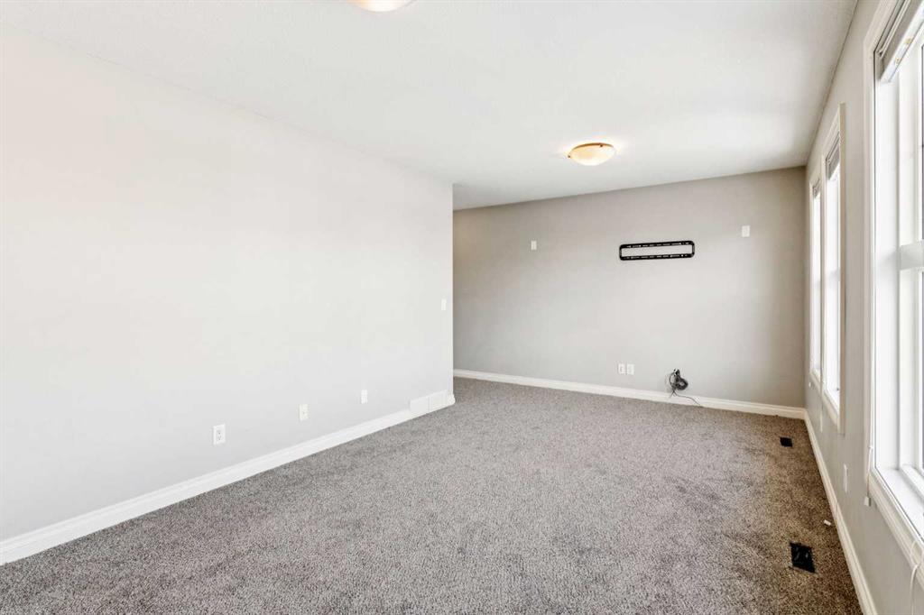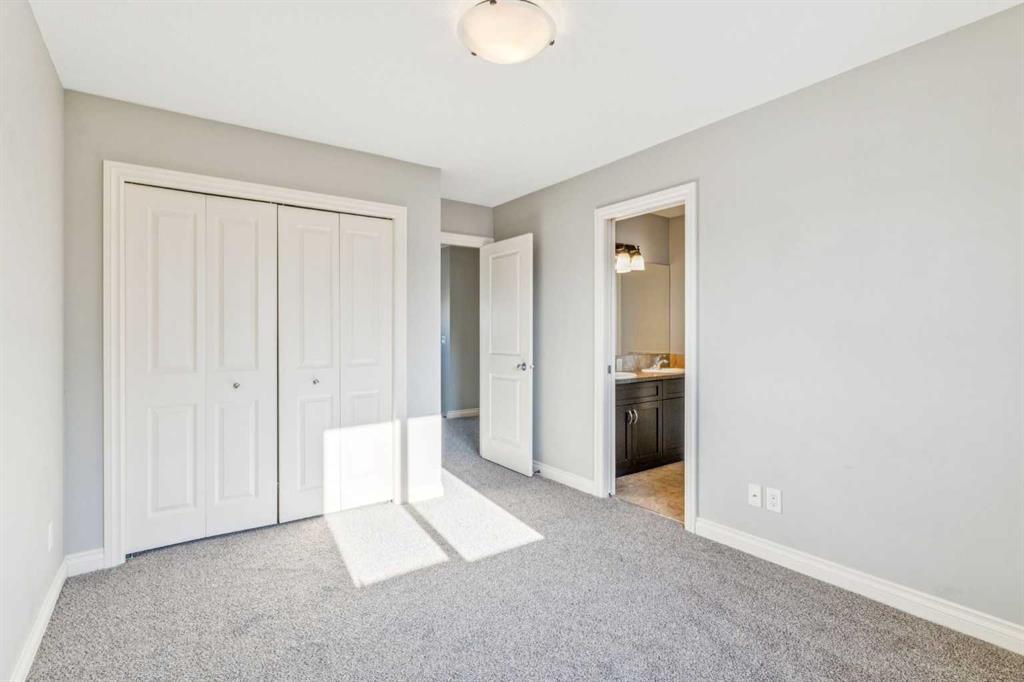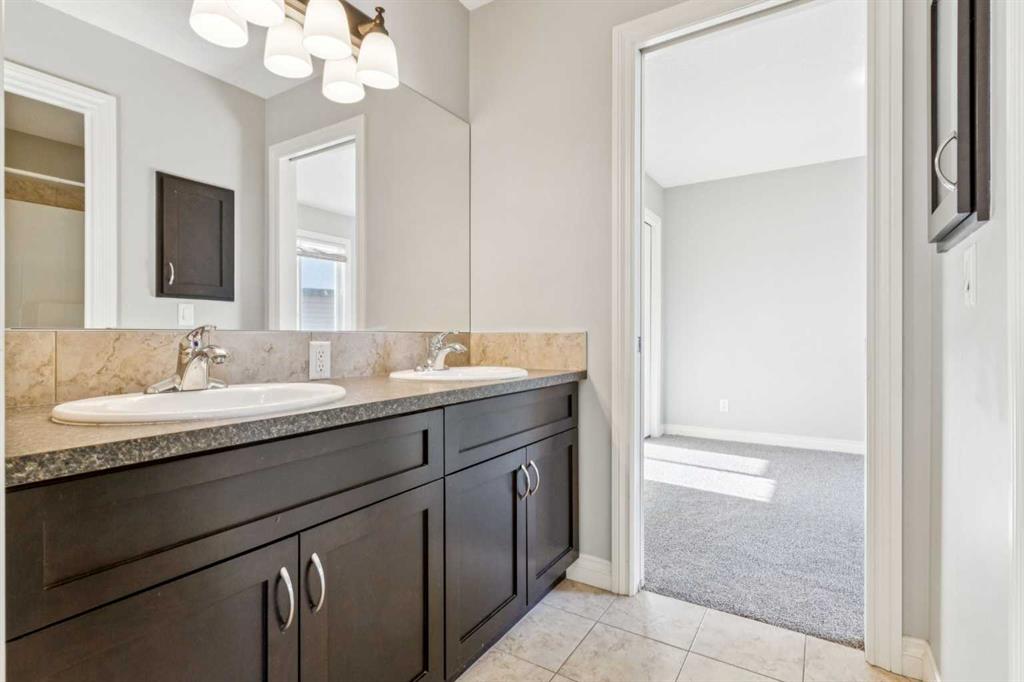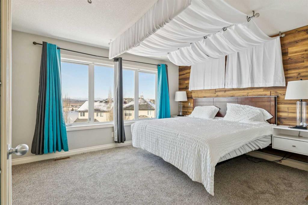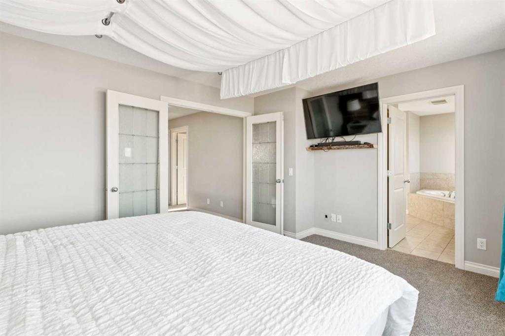 Upstairs, brand-new carpet leads to a bright open hallway and elegant French doors opening into the primary suite — a true hotel-style retreat featuring a custom built-in king-size bed with integrated lighting and breathtaking mountain views. The spa-inspired ensuite includes a corner soaker tub, granite countertops, and a double vanity. Two generously sized bedrooms share a 3-piece Jack & Jill bathroom, along with a dedicated laundry room and a massive bonus room overlooking the cul-de-sac with soaring ceilings and an abundance of natural light.