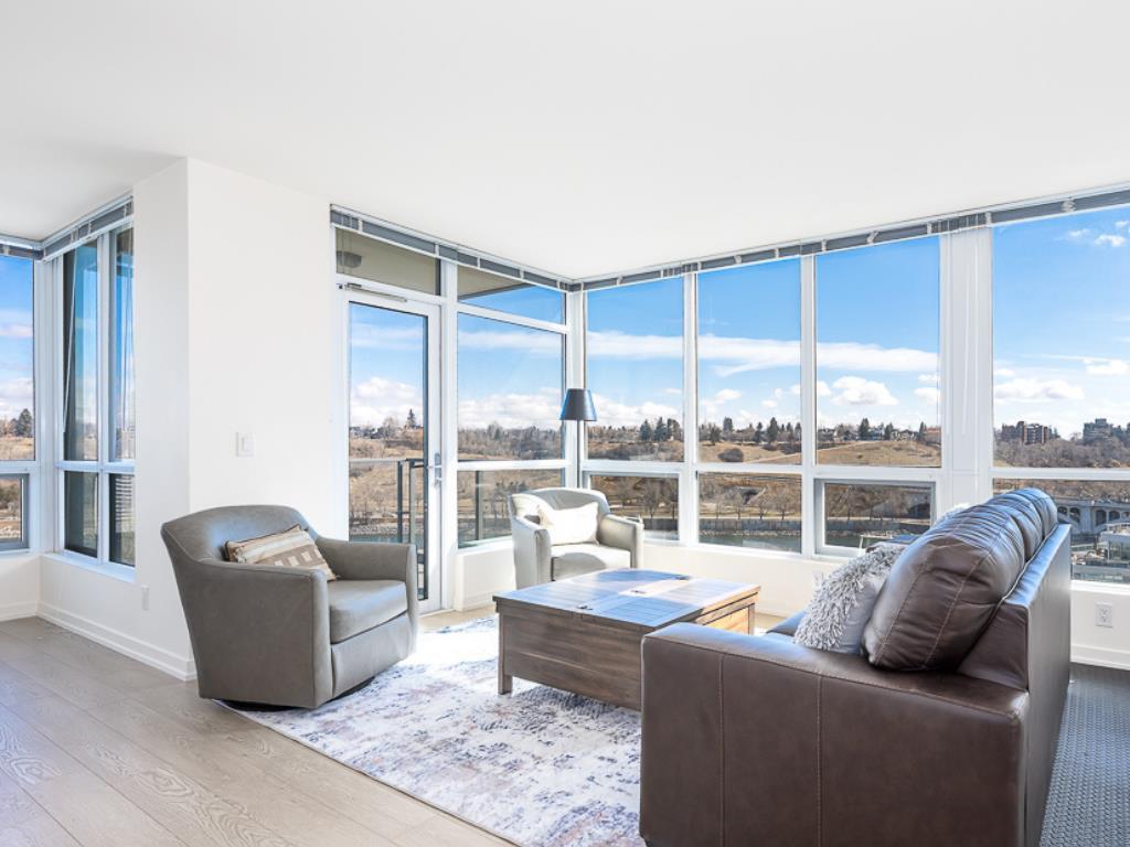 Welcome to this exceptional TWO-bedroom, TWO-bathroom corner residence with TWO parking stalls, perched on the 11th floor of Outlook at Waterfront. Offering amazing panoramic views of the Bow River valley, this home delivers a truly remarkable urban living experience. Flooded with natural light through expansive floor-to-ceiling windows, this thoughtfully designed suite showcases breathtaking, unobstructed river views from throughout the unit. Step onto your private balcony, perfect for relaxing or entertaining, while enjoying scenic vistas that stretch west toward the mountains. The modern, open-concept layout seamlessly blends comfort and style. The chef-inspired kitchen features stone countertops, a gas cooktop, integrated appliances, pantry storage, and a central island with eating bar, ideal for both everyday living and hosting. Wide-plank laminate flooring and ceramic tile run throughout, adding warmth and sophistication. Designed for privacy, the two bedrooms are positioned on opposite sides of the suite. The primary retreat offers generous closet space and a sleek three-piece ensuite, while the second bedroom is perfect for guests, a home office, or added flexibility. A full four-piece bathroom and in-suite laundry complete the interior. This home is further enhanced by TWO side-by-side assigned parking stalls and a secured storage locker. Residents of Outlook at Waterfront enjoy access to premium amenities, including a fully equipped fitness centre, yoga studio, hot tub and sauna, theatre room, party and recreation lounge, guest suite, and professional concierge service. Perfectly positioned along the Bow River, you are just steps from the Bow River and its extensive network of river pathways and Prince’s Island Park, while being within walking distance to downtown offices, trendy restaurants, cafés, and pubs. With nearby LRT access and major transit routes, connectivity throughout the city is effortless. This is more than a home; it is a lifestyle defined by location, views, and luxury.