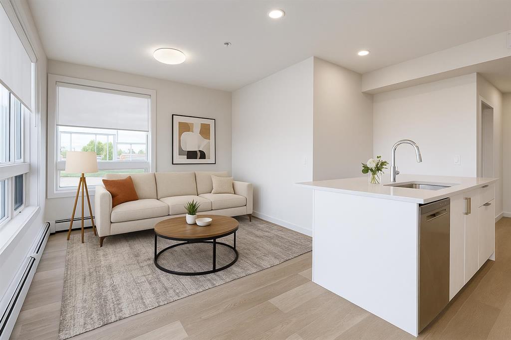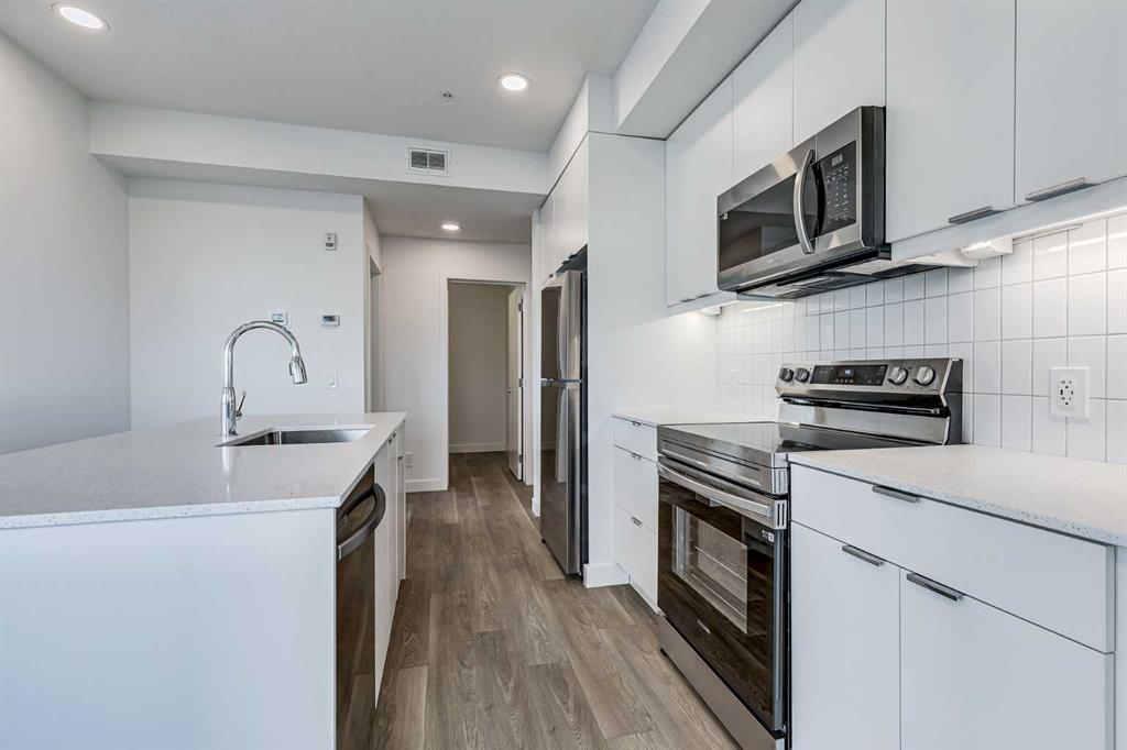 Welcome to this spacious west-facing main floor corner unit, featuring one of the largest decks available (7.2 x 31 ft)—perfect for outdoor entertaining or enjoying your morning coffee in the sun. Inside, the well-designed layout includes a generous primary suite complete with a beautiful 3-piece ensuite, a second bedroom, and a versatile den ideal for a home office. The open-concept living room flows seamlessly into the kitchen, which boasts stunning brand new stainless steel appliances and sleek quartz countertops. A second 4-piece bathroom adds to the unit’s convenience. Additional highlights include in-suite laundry, a titled underground parking stall, and a titled storage locker. Located just across from East Hills Shopping Centre and close to parks, transit, and with quick access to Stoney Trail, this home offers a perfect blend of comfort, lifestyle, and accessibility. In a pet-friendly building with low condo fees, this is an ideal opportunity for first-time buyers, downsizers, or investors looking to be part of Calgary’s vibrant and growing east side. This one has it all—location, layout, and abundant natural light.