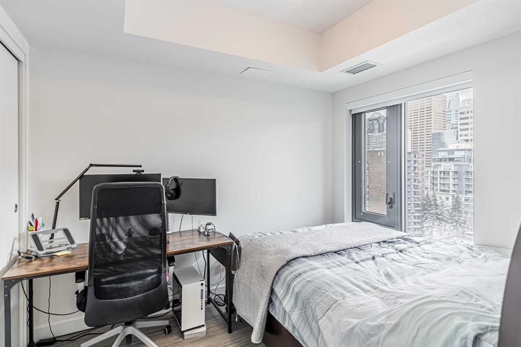 The best location, move-in-ready 1-bed + den, and 4pc bathroom by Graywood is steps from downtown offices, dining, shopping, and theaters, with Bow River trails, Prince Island Park, and Peace Bridge nearby for year-round activities like jogging, kayaking, and ice skating.Sun-drenched interiors feature floor-to-ceiling windows, high-end vinyl plank flooring, and an open-concept layout. The modern kitchen has stainless steel appliances, while the versatile den works as an office, nook, or guest space. The serene master bedroom offers ample storage, and the contemporary bathroom has a resort-like feel. Your private balcony boasts sweeping city views, perfect for morning coffee or evening relaxation.