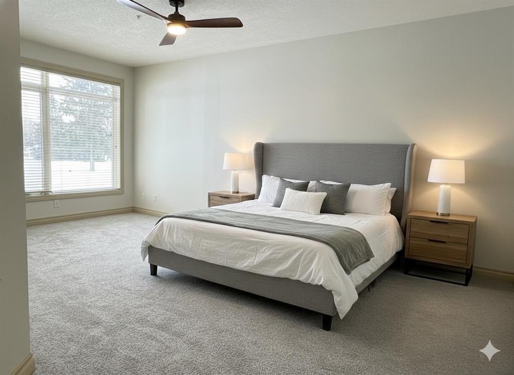 Situated within the sought-after Copperwood complex of Spruce Cliff, this main-level residence offers nearly 1,500 square feet of refined living space backing directly onto the Shaganappi Point Golf Course. The open-concept layout is defined by high ceilings and large windows that provide a bright, airy atmosphere, with hardwood flooring flowing through the great room and dining area. The living space is anchored by a gas fireplace and custom built-ins, offering a warm and inviting focal point. Just off the dining area, a private den is accessed through elegant glass French doors, providing a quiet and versatile space for a home office or library. The kitchen is designed for both style and function, featuring granite countertops, stainless steel appliances, and a pantry complete with a built-in spice rack for optimized storage. The primary suite serves as a quiet retreat with ample space for a king-sized bed, a walk-in closet, and a five-piece ensuite with a soaking tub and separate shower. A generous second bedroom is complemented by a main bathroom featuring a walk-in steam shower, offering a spa-like experience at home. For added convenience, the residence includes a functional laundry room with a stacking washer and dryer and enough additional space for organized storage. This home also includes two underground parking stalls and a dedicated storage locker. Residents of Copperwood enjoy access to the Copper Club, which features a well-equipped gym, meeting room, and social lounge, along with an available guest suite for visitors. Located just minutes from downtown Calgary via Bow Trail, the property offers easy access to public transportation and the various amenities of Westbrook Mall, including Safeway and Starbucks. This home represents a refined lifestyle choice, blending the serenity of golf course views with the convenience of an established urban community.