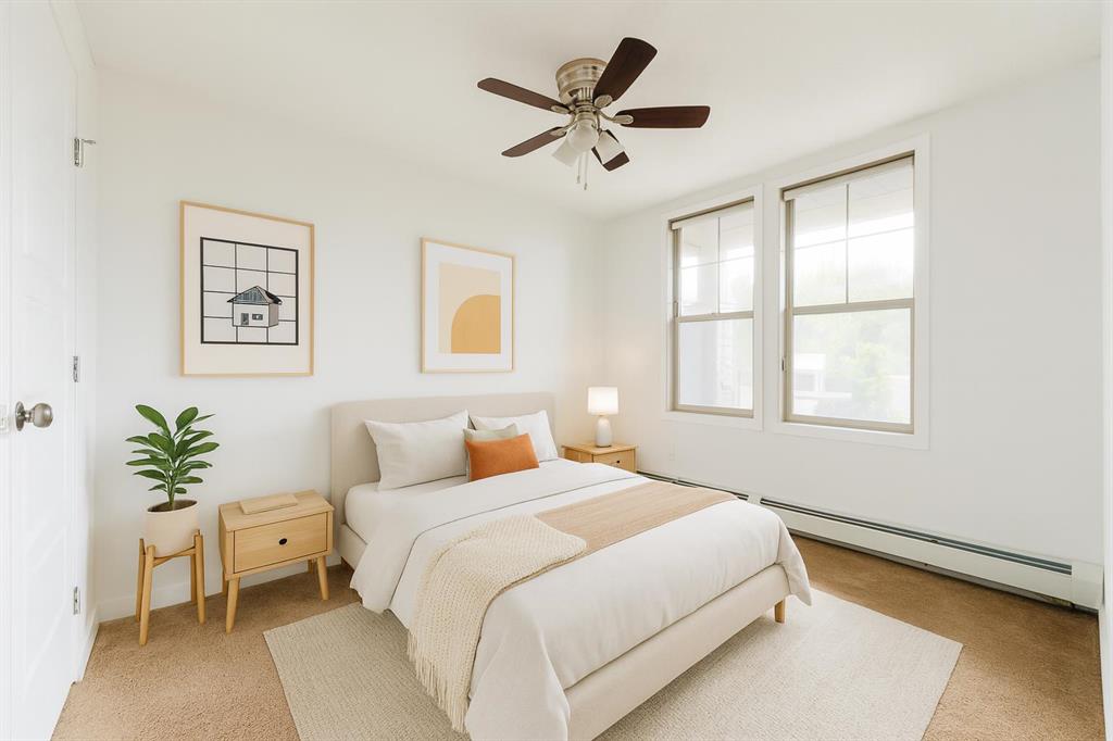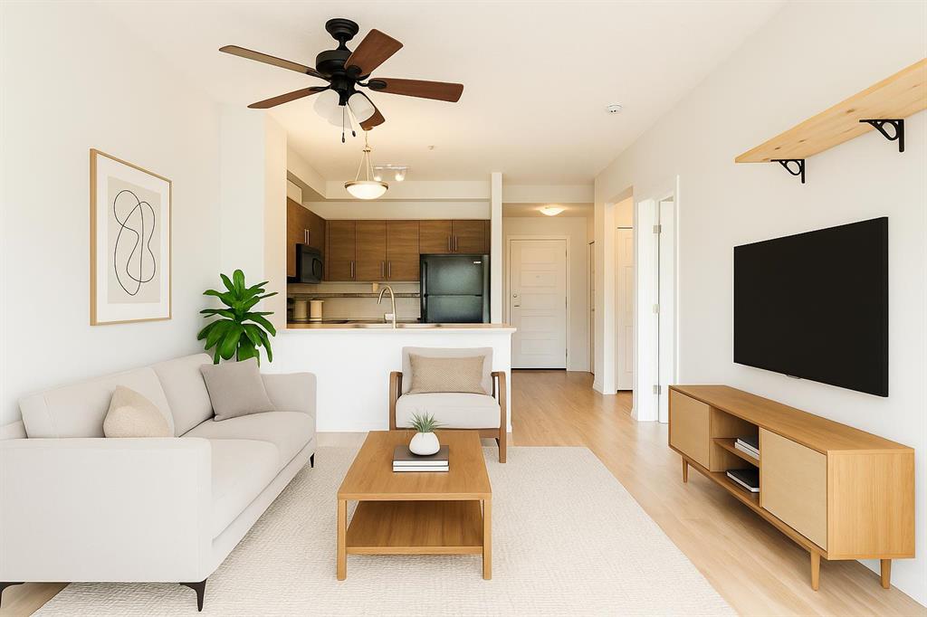 Inside, high ceilings and oversized windows fill the open living space with natural light, while the modern kitchen with breakfast bar and generous storage blends practicality with social charm. The spacious bedroom and walk-in closet bring everyday luxury, and in-suite laundry with extra storage keeps life simple.