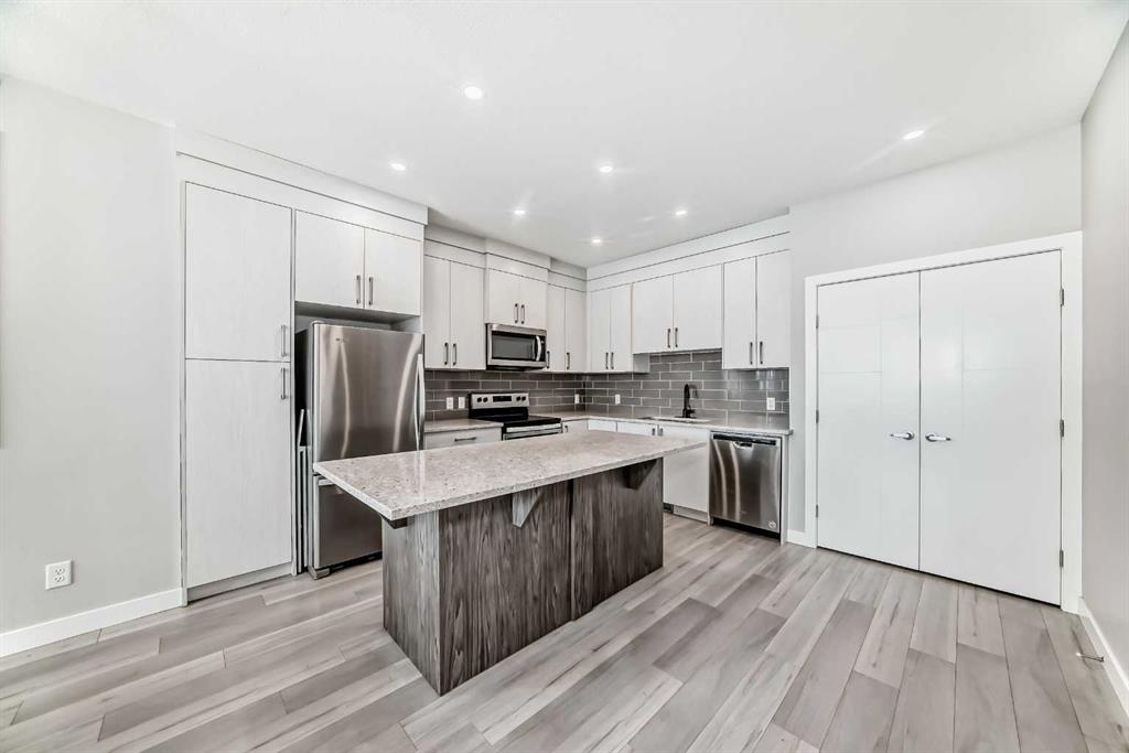 Welcome to one of Calgary’s most sought-after communities, Redstone, where convenience, connectivity, and community come together. This beautifully maintained end-unit, fully finished four-bedroom townhome offers over 1,750 sq. ft. of professionally developed living space and an abundance of natural light thanks to its desirable end-unit placement. Designed with both comfort and functionality in mind, the open-concept main floor provides a versatile layout where the living and dining areas can be arranged to suit your lifestyle. The modern kitchen is a true highlight, featuring quartz countertops, sleek appliances, a spacious center island, and an impressive amount of cabinetry, offering generous storage and prep space for everyday living and entertaining. The clean, contemporary white interior enhances the bright and airy feel of the home. A convenient two-piece powder room on the main level adds practicality for guests. Upstairs, a generously sized primary bedroom serves as a private retreat complete with a walk-in closet and a full four-piece ensuite bathroom. Two additional spacious bedrooms and another four-piece bathroom provide comfortable accommodations for family members or guests. The professionally builder-finished basement extends your living space even further, offering a large recreation or family room, a fourth bedroom, a third four-piece bathroom, and ample storage throughout—ideal for growing families, multi-generational living, or a dedicated home office or gym setup. Additional value includes a newly replaced roof (November 2025) for added peace of mind. Surrounded by restaurants, grocery stores, playgrounds, and everyday amenities, this vibrant neighborhood also features over 3.5 km of scenic walking paths that connect residents to the outdoors and to each other. With close proximity to public transit and quick access to major roadways, commuting in and around Calgary is seamless. Combining space, functionality, and an unbeatable location, this move-in-ready home presents an exceptional opportunity in Redstone. Book your private showing today.