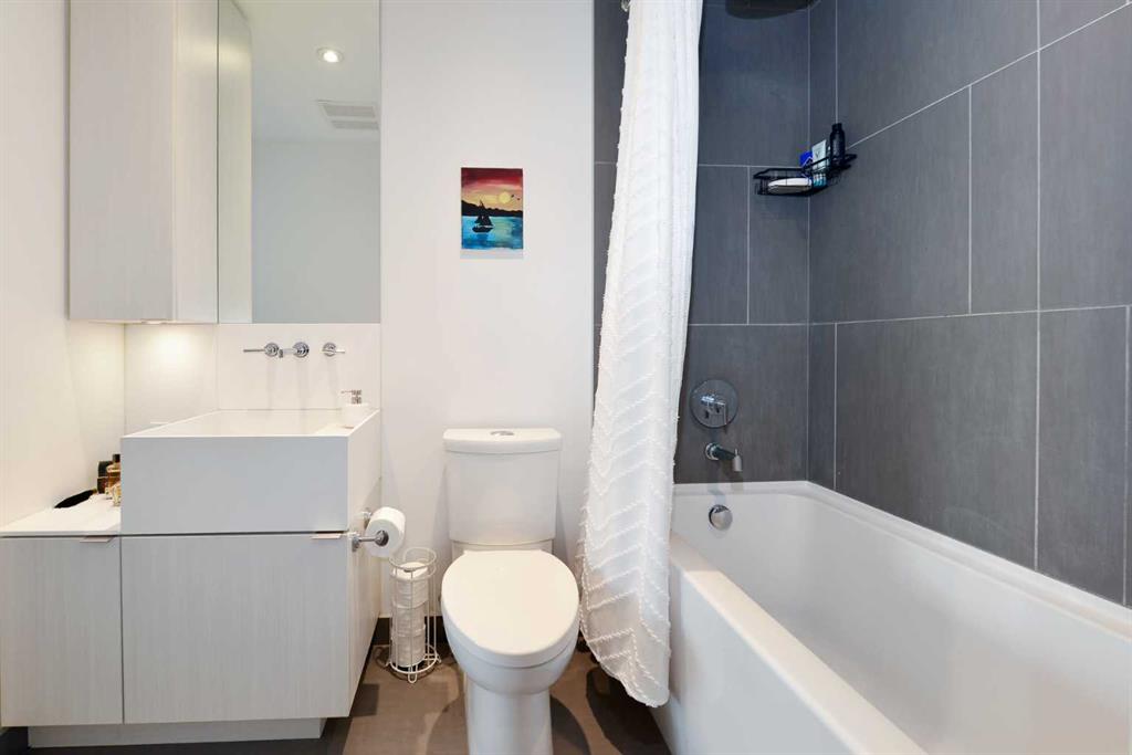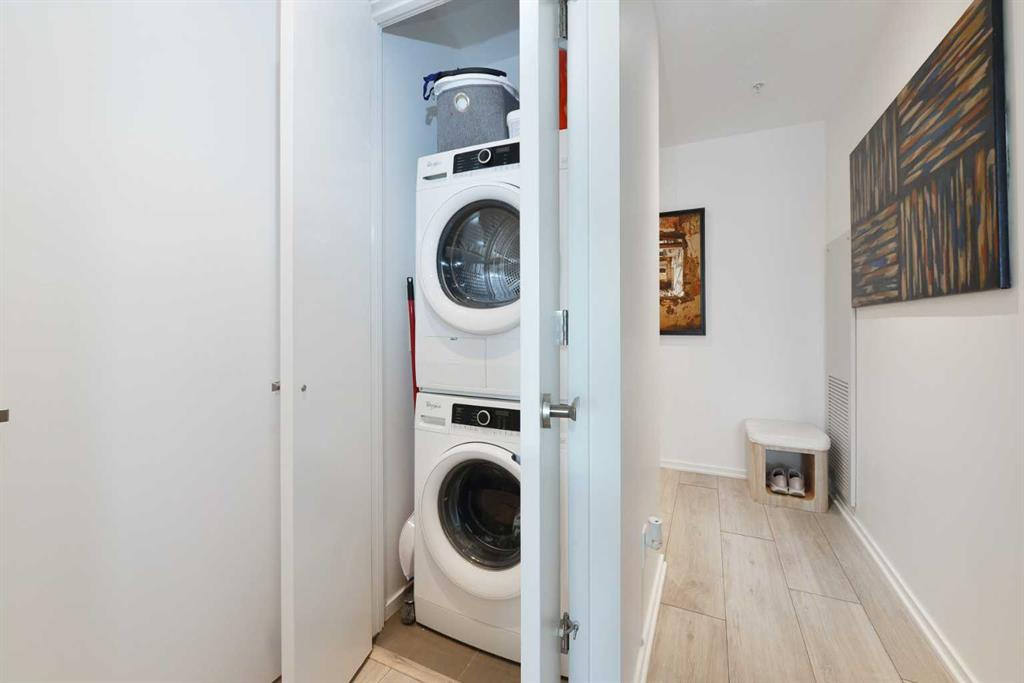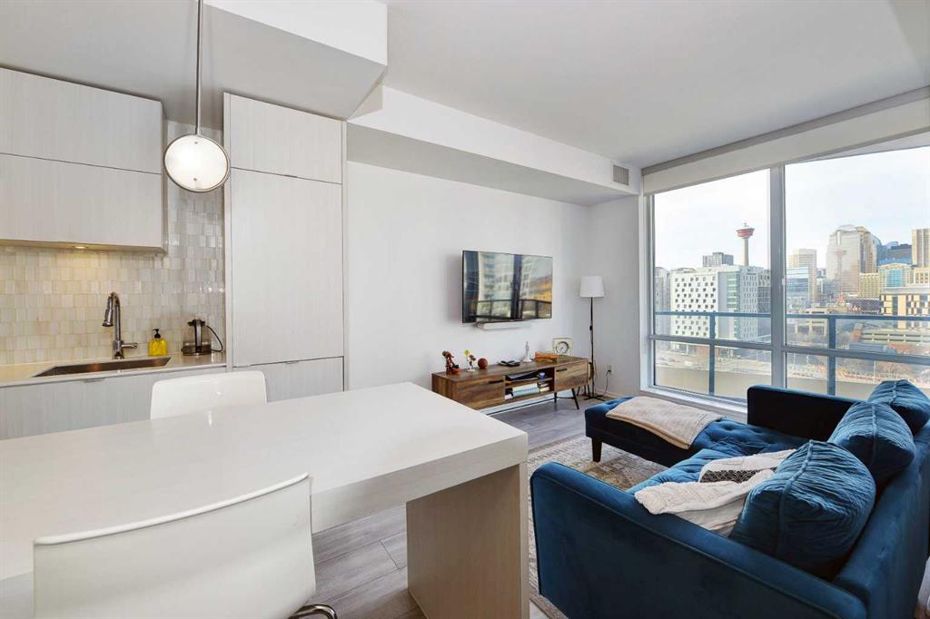 Welcome to this beautifully designed 1-bedroom plus den condo in The Verve, one of East Village’s most desirable buildings. Perfectly positioned on the 11th floor, this home offers bright, modern living with stunning west views of the downtown skyline. The open floor plan features 9-foot ceilings and floor-to-ceiling windows that fill the space with natural light. The sleek, contemporary kitchen features quartz countertops, a central island with a breakfast bar, stainless steel appliances, an electric cooktop, a built-in oven, and a stylish glass tile backsplash, an ideal setup for cooking or hosting friends. The living room offers the perfect place to unwind at the end of the day, with easy access to your private west balcony, an incredible spot to enjoy sunsets and warm summer evenings. The large primary bedroom provides a quiet retreat, while the spacious den offers the perfect home office, guest room or flex space. A well-appointed 4-piece bathroom and convenient in-suite laundry complete the thoughtful layout. Stay comfortable year-round with central air conditioning, and enjoy the convenience of titled underground parking. Residents of The Verve enjoy access to premium amenities, including a fitness centre, guest suite, party room, rooftop patio, and recreation lounge. This unbeatable location is steps from the Riverwalk Pathway system, Prince’s Island Park, Studio Bell, and the Central Library. Superstore, Bow Valley College, and countless shops and cafés are all just minutes away. Whether you’re a professional, first-time buyer, or investor seeking vibrant urban living, this home offers an exceptional opportunity. Don’t miss your chance, book your showing today!