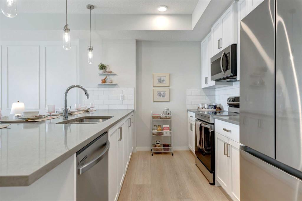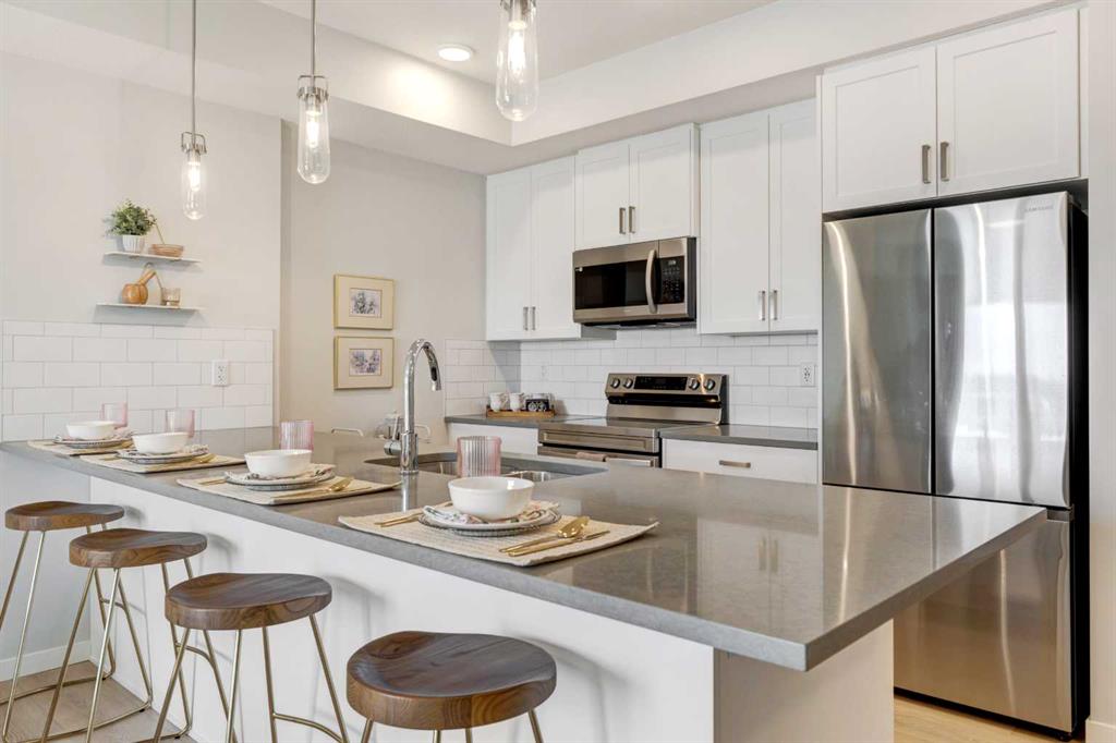 INTRODUCING ALPINE PARK PLACE, IN BEAUTIFUL SOUTHWEST CALGARY. BUILT BY CEDARGLEN LIVING, WINNER OF THE Customer Insight BUILDER OF CHOICE AWARD, 6 YEARS RUNNING! BRAND NEW “A” unit with high-spec features. You will feel right at home in this well thought-out, 514. RMS sq.ft. (565 sq.ft. builder size). 1 bed, 1 bath home with open plan, 9′ ceilings, LVP flooring throughout common areas, carpets in the bedrooms and closets, Low E triple glazed windows, BBQ gas line on the patio, Fresh Air System (ERV), and so much more. The kitchen is spectacular with full height cabinets, quartz counters, undermount sink, rough-in water line to the fridge and S/S appliances. The island is extensive with built in flush breakfast bar, which transitions into the spacious living area, perfect for entertaining. The spacious bedroom has a large bright window (triple pane windows) and sizeable closet. Right beside your bedroom is a 4pc bath with quartz counters, and undermount sink. Nearby is the spacious laundry/storage room, this is a must see (washer & dryer included). Highlights include: Hardie board siding, designer lighting package, sound reducing membrane to reduce sound transmission between floors, clear glass railing to balconies and 1 titled surface parking stall included (storage lockers available for purchase). A once in a lifetime community in Southwest Calgary. PET FRIENDLY COMPLEX, PRE-CONSTRUCTION OPPORTUNITY, PURCHASER CAN STILL MAKE SELECTIONS, and PHOTOS ARE OF A DIFFERENT SHOW SUITE FOR REFERENCE ONLY, FINISHING’S/PLAN WILL DIFFER. ESTIMATED COMPLETION RANGE IS JUNE 2026-DEC 2026. VISIT THE SHOW SUITE TODAY FOR MORE INFO & FALL PROMOTION!