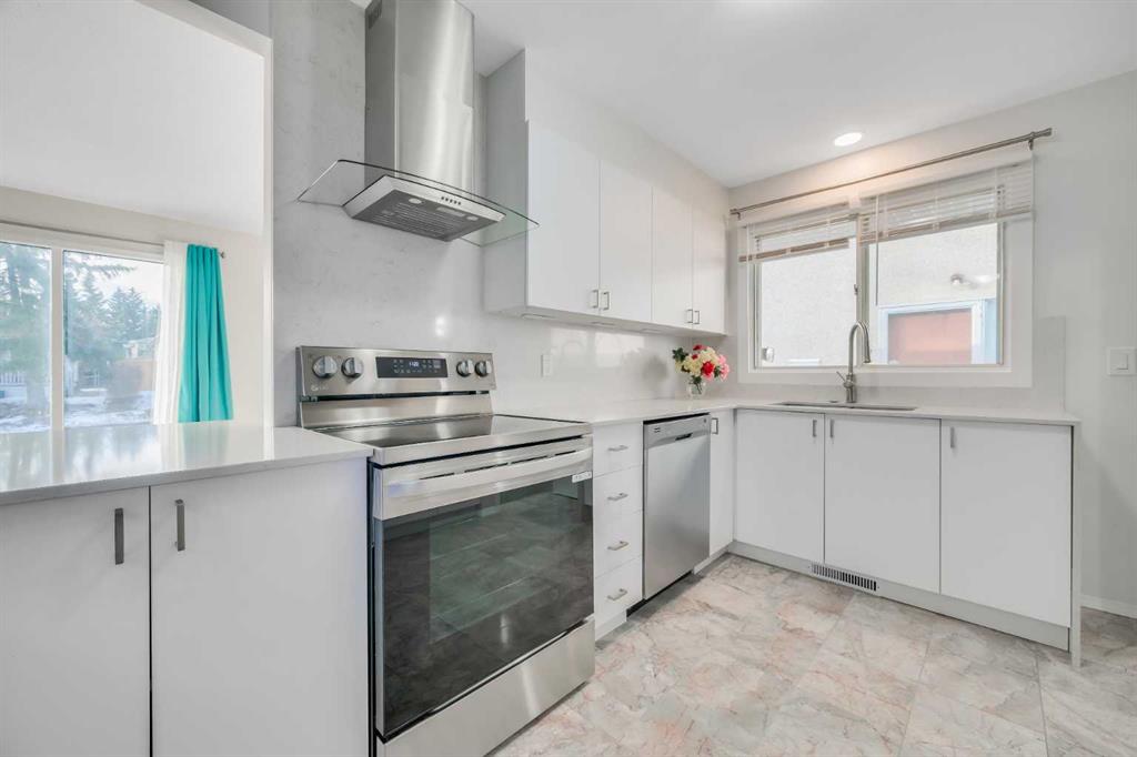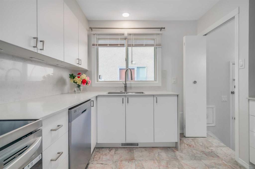 The tastefully renovated kitchen (2024) includes a functional window, trendy white cabinetry, quartz countertops with breakfast bar, stainless steel appliances, granite tile flooring, and practical open shelving. A convenient pantry and cleaning closet are just steps away.