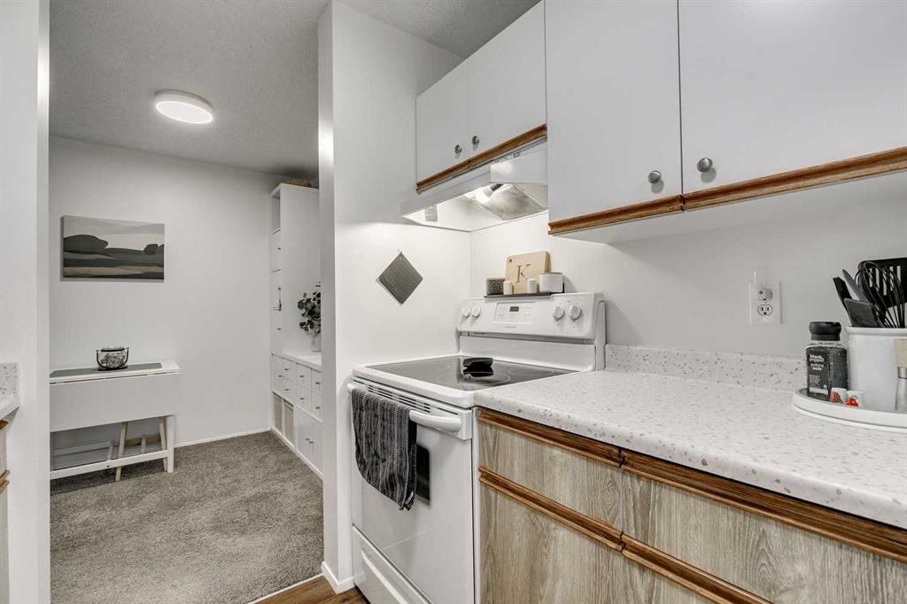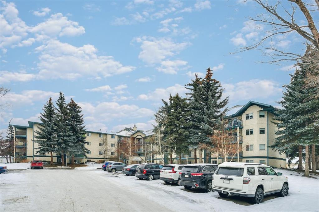 IMMACULATE + TASTEFULLY RENOVATED, POLY-B REMOVED, PET FRIENDLY (large dogs allowed with board approval). This condo features a bright, open floorplan in a well managed complex with 1 bedroom & 1 bathroom with soaker tub. Upgrades include fresh paint, vinyl flooring, newer lights, toilet, faucets, drapes, closet doors & thermostat. The good-sized bedroom boasts closet organisers & a sunny east facing window. Laundry room located in-suite with newer washer/dryer & freezer. This open floorplan will easily accommodate a family sized gathering in the spacious dining room + living room. The unit comes with ample storage including a large wall unit in the dining room, storage cabinets, shelves, patio furniture. Parking stall is located just steps away from the unit’s very private, spacious, covered patio with newer tile flooring & sliding glass door access off the living room. Seconds from Peigan Trail, Deerfoot Trail & the new Ring Road System & minutes from Downtown Calgary not to mention walking distance to shopping, schools, parks, playgrounds & more. Bus stop conveniently located directly in front of the building. Great for first time buyers or investment property!