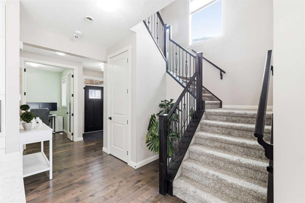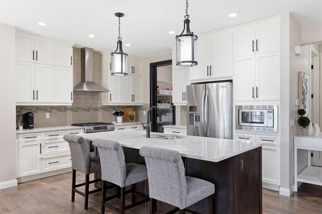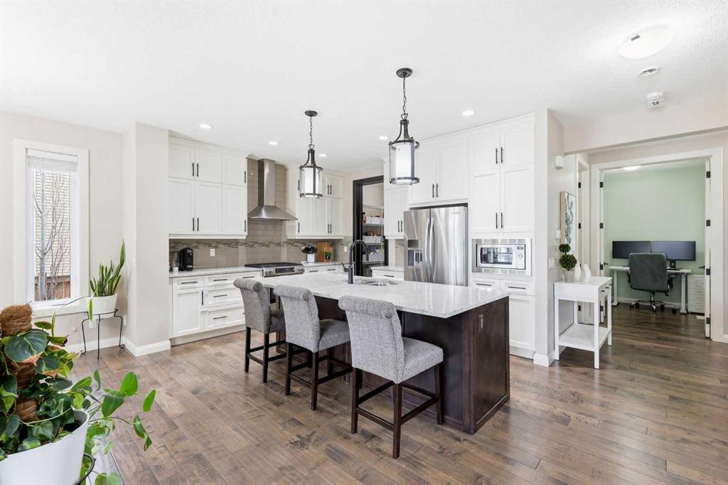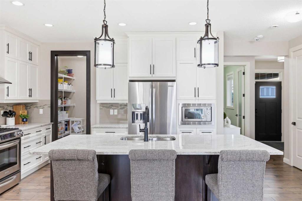 Welcome to 113 Kinniburgh Way, a stunning family home wrapped in premium concrete fibre siding, nestled in Chestermere’s highly desirable Kinniburgh community. Boasting over 2,400 sq. ft. of bright, above-grade living space, the open-concept main floor is elevated by soaring 9ft ceilings and built-in in-home speakers. The layout is designed for both entertaining and everyday life, featuring a dedicated home office, a spacious living and dining area, and a gorgeous kitchen showcasing granite counters and a walk-through pantry. This connects right to the mudroom and the oversized 24′ x 22′ heated double attached garage, making Alberta winters a breeze.