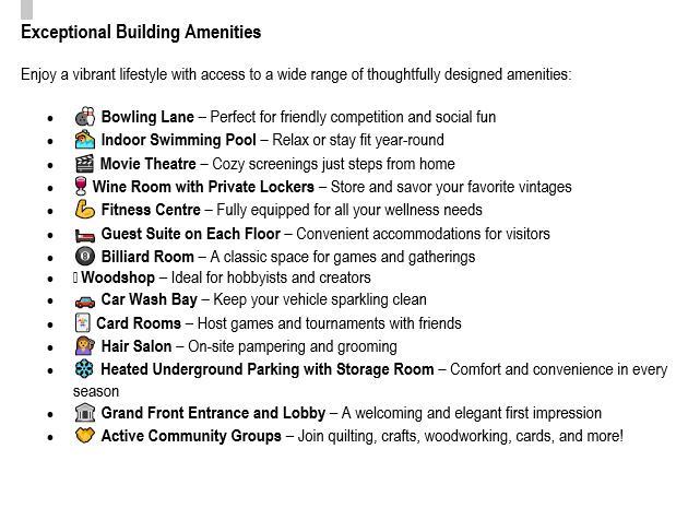 Sanderson Ridge offers exceptional amenities: bowling lanes, indoor swimming pool, movie theatre, wine room with private lockers, fitness centre, guest suites on each floor, billiard room, woodshop, car wash bay, card rooms, hair salon, heated underground parking with storage, a grand front entrance and lobby, and active community groups for quilting, crafts, woodworking, cards, and more.