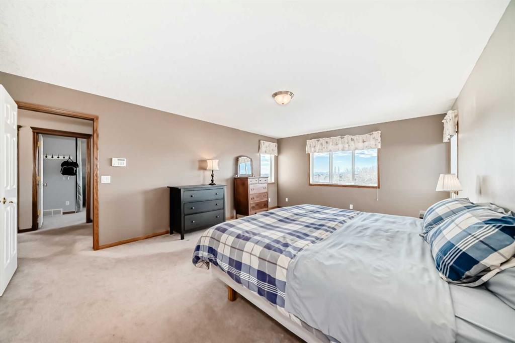 A striking two-way, see-through gas fireplace creates warmth and ambiance between the living room and adjacent den/office. The functional walk-through pantry connects to a well-appointed laundry room with sink and vanity and provides convenient access to the oversized double & 1/2 attached garage. Most garages will barely hold 2 vehicles. This one will do the job and have space left over. Soaring ceilings welcome you at the front entry, complemented by a split oak staircase leading upstairs. One wing hosts three generously (Huge) sized bedrooms, while the opposite side features a spacious bonus room designed as a home theatre with blackout window coverings and built-in speaker wiring. Custom storage systems enhance the primary walk-in closet and an additional bedroom. The primary suite easily accommodates a king-size bed and sitting area and is complete with a luxurious five-piece ensuite featuring a soaker tub and walk-in shower. You should see the view from all 3 sides of the primary bedroom.