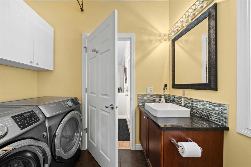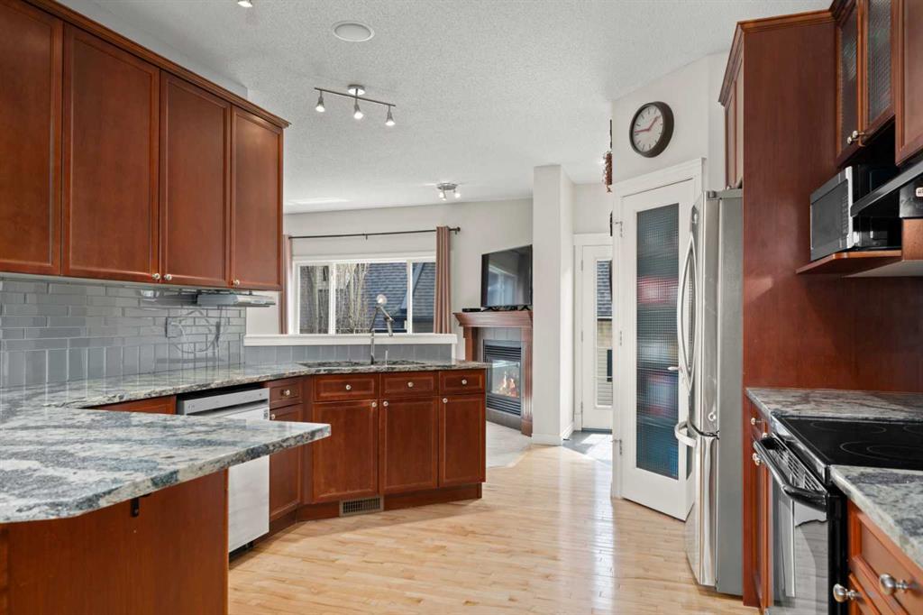 The living room is generously sized and features a corner fireplace, creating a comfortable gathering space with views of the south-facing backyard. A 2-piece bathroom and main floor laundry with tile flooring and granite counters complete this level.