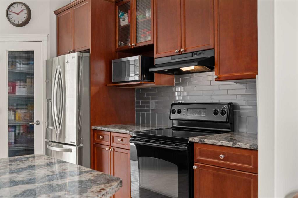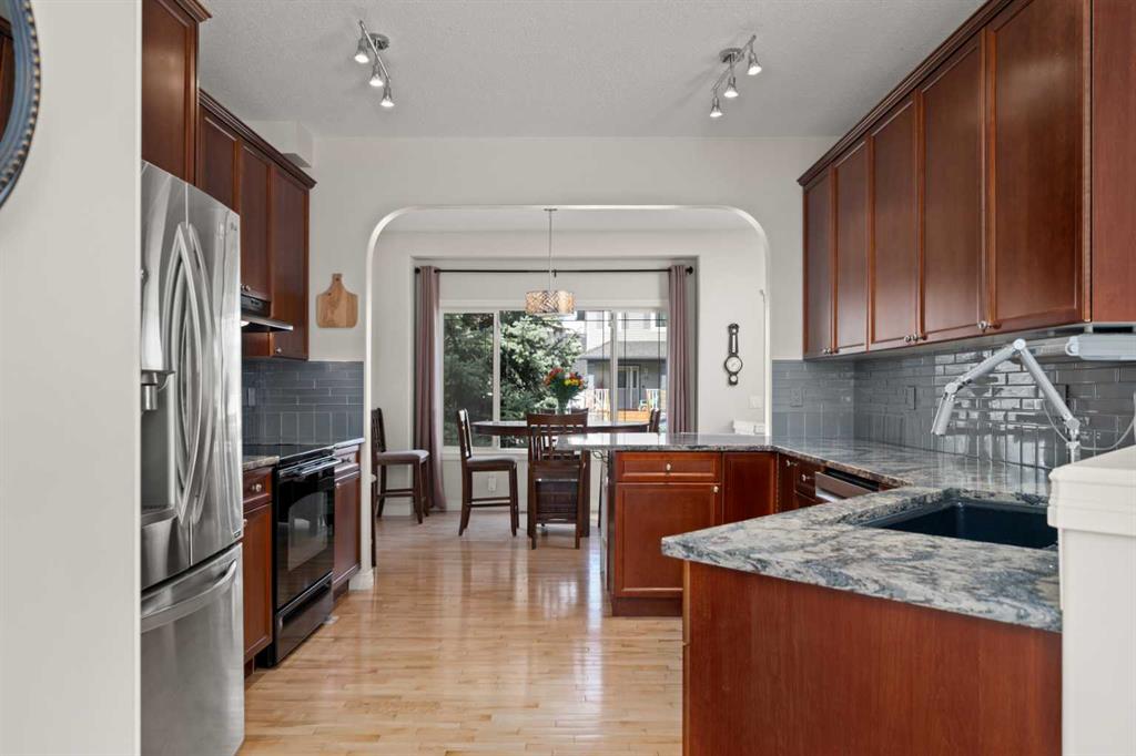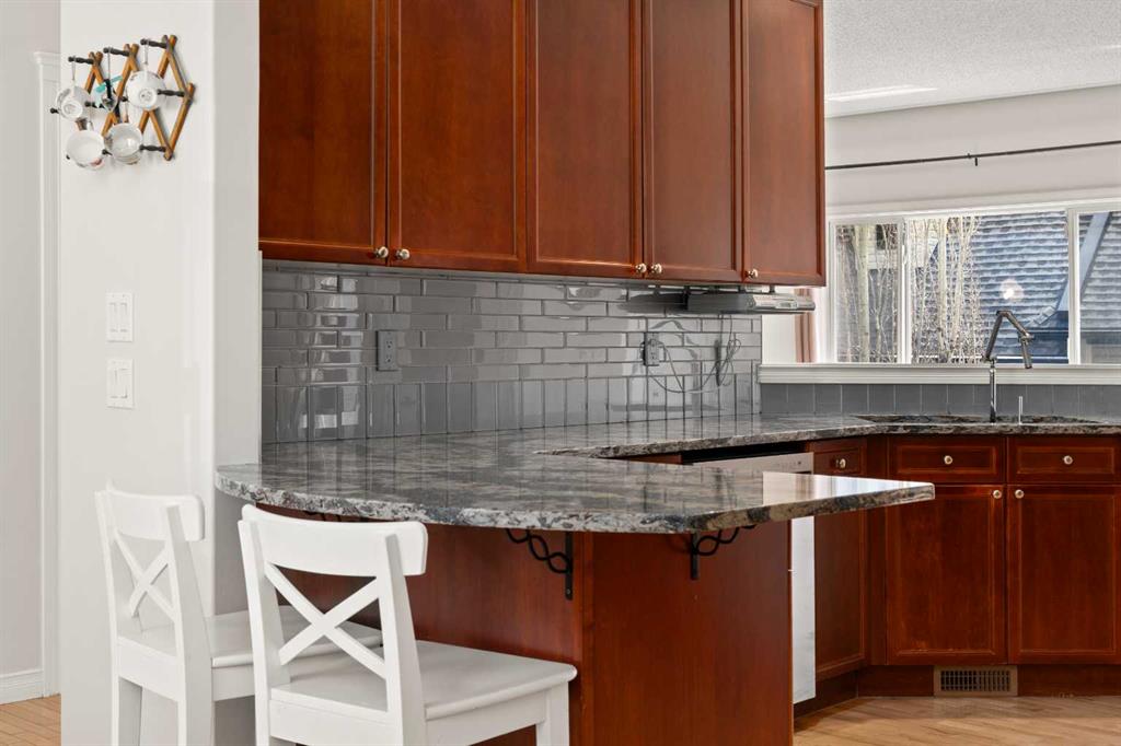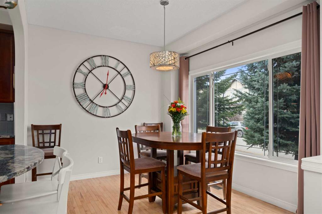 Inside, the main floor features hardwood flooring through most of the main level and a practical, open layout. The front dining area is bright and spacious, overlooking the front yard—ideal for both everyday living and entertaining. The kitchen is thoughtfully designed with granite countertops, extended-height cabinetry, glass tile backsplash, a large pantry, and an eating bar, along with plenty of prep and storage space.
