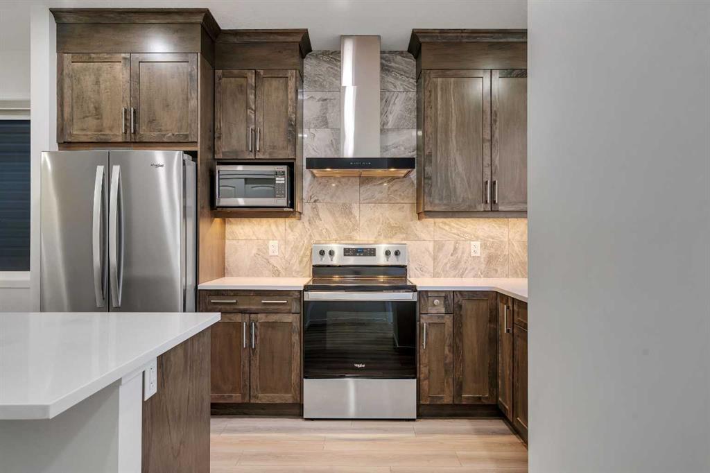 Shows like new! This spacious two-storey property offers over 1844 sq. ft above grade and includes a LEGAL 723 sq. ft, 2-bedroom basement suite, making it ideal for multi-generational living or added income potential. The main level features a bright, open-concept layout with a living room and a well-appointed kitchen complete with central island with seating, quartz counter tops, and pantry. A versatile front flex room provides the option for a home office or main-floor bedroom, and a 3-piece bathroom with walk-in shower completes this level. Upstairs, you’ll find a spacious bonus room, laundry, primary bedroom with walk in closet and ensuite, 2 additional bedrooms and a 4-piece bathroom. The builder-developed basement has a separate entrance and hosts the legal suite, featuring a full kitchen, two bedrooms, a 4-piece bathroom, and in-suite laundry—perfect for extended family or tenants. There is a large deck in the back and off-street parking. Located on a quiet street, this home is close to parks, schools, transit, and shopping, with convenient access to major thoroughfares for easy commuting.