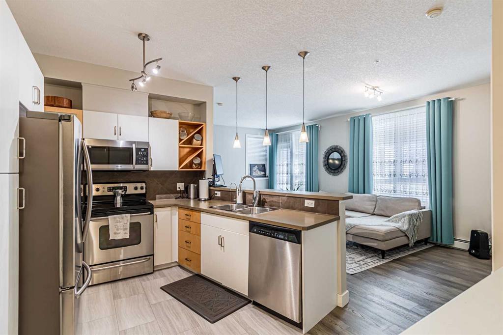 With the Altadore river park and Marda Loop just minutes away, this 2 bedroom unit with 9′ ceilings in Kabo is a stylish condo in the perfect location! This property has stainless steel appliances in the kitchen, plenty of cabinets and a breakfast bar with an open concept to the living room that is ideal for entertaining. The living room has a corner gas fireplace and brand new hardwood floors that extend into the two bedrooms. The master bedroom is a nice size and has a walk-in closet that connects to a 4 piece bathroom. The second bedroom is also a good size and can alternatively be used as a home office or fitness room. This property also has insuite laundry and plenty of windows that bring in an abundance of natural light to the unit. There is a patio just off the living room that is perfect for summer relaxation and BBQs. This condo has an underground secured parking stall as well as a secured storage locker. Call to view today!