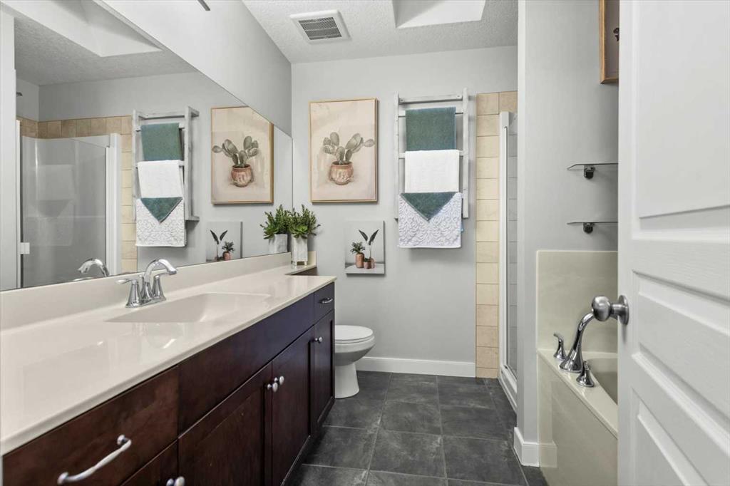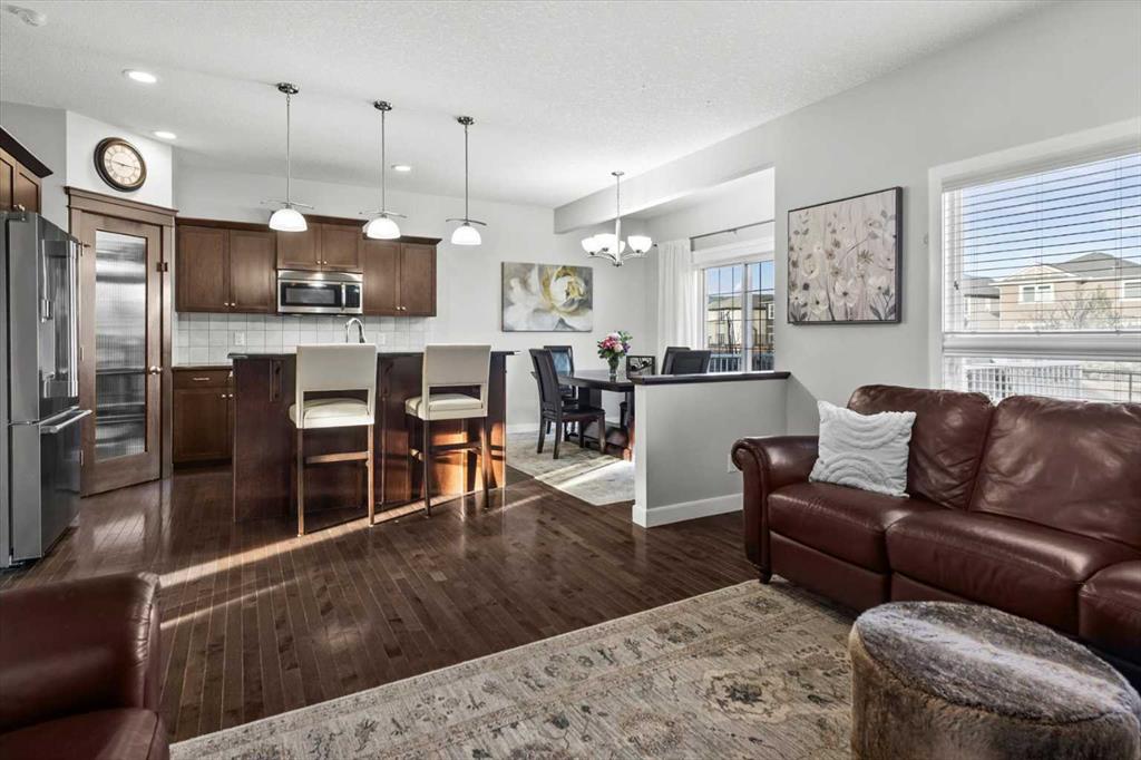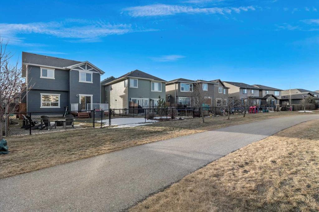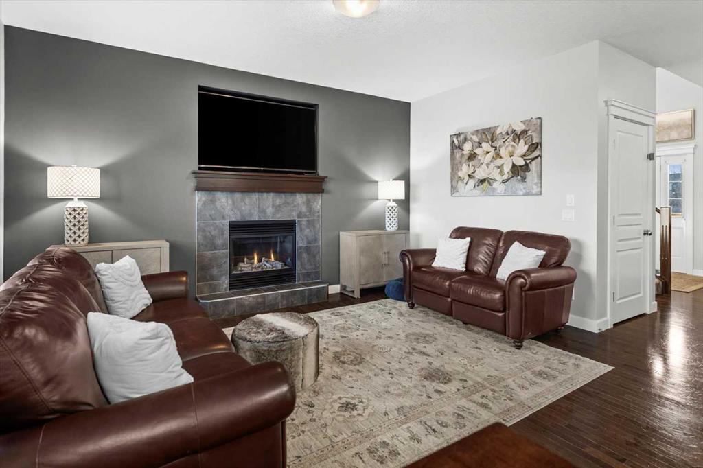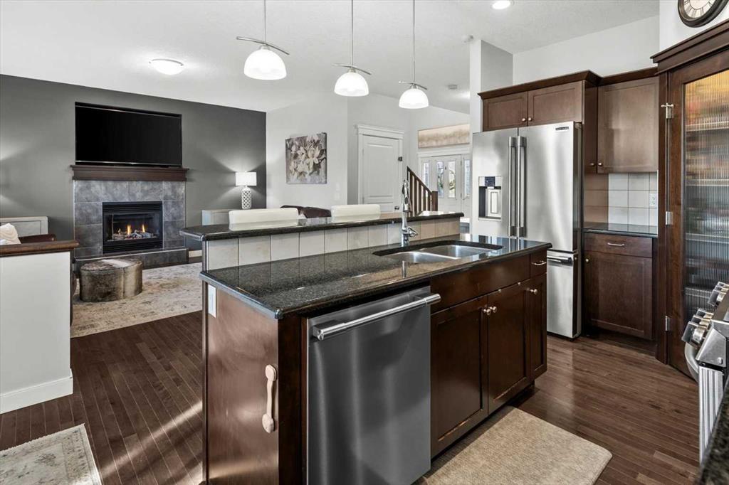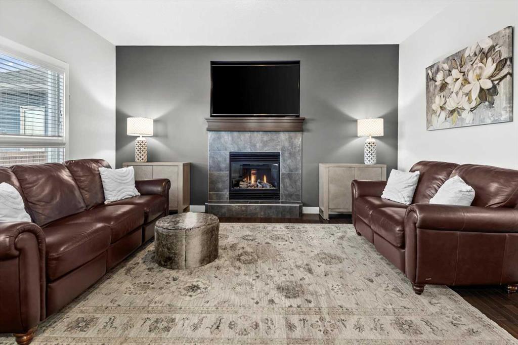 Meticulous, designer-inspired two-story home in the Airdrie community of Ravenswood. The welcoming foyer leads into a bright, open-concept main living area. The kitchen is beautifully appointed with a central island and breakfast bar, new stainless-steel appliances (including an exceptional gas range), and a walk-in pantry. Open to the kitchen, the family room features a cozy gas fireplace and outdoor views of the adjoining green space with its convenient walkway. Step outside to a private, fully fenced backyard with a fire pit—perfect for summer evenings with friends. Upstairs discover a bright, spacious bonus room, three bedrooms, and a 4-piece main bath. The primary retreat offers a customized walk-in closet and a 4-piece ensuite complete with a soaker tub and skylight. The unfinished lower level awaits a finishing design to suit your lifestyle. Ideally located close to Heloise Lorimer School and École des Haute-Plaines (K–12), with easy access to Highway 2 for easy commuting north and south, including YYC airport and downtown Calgary.