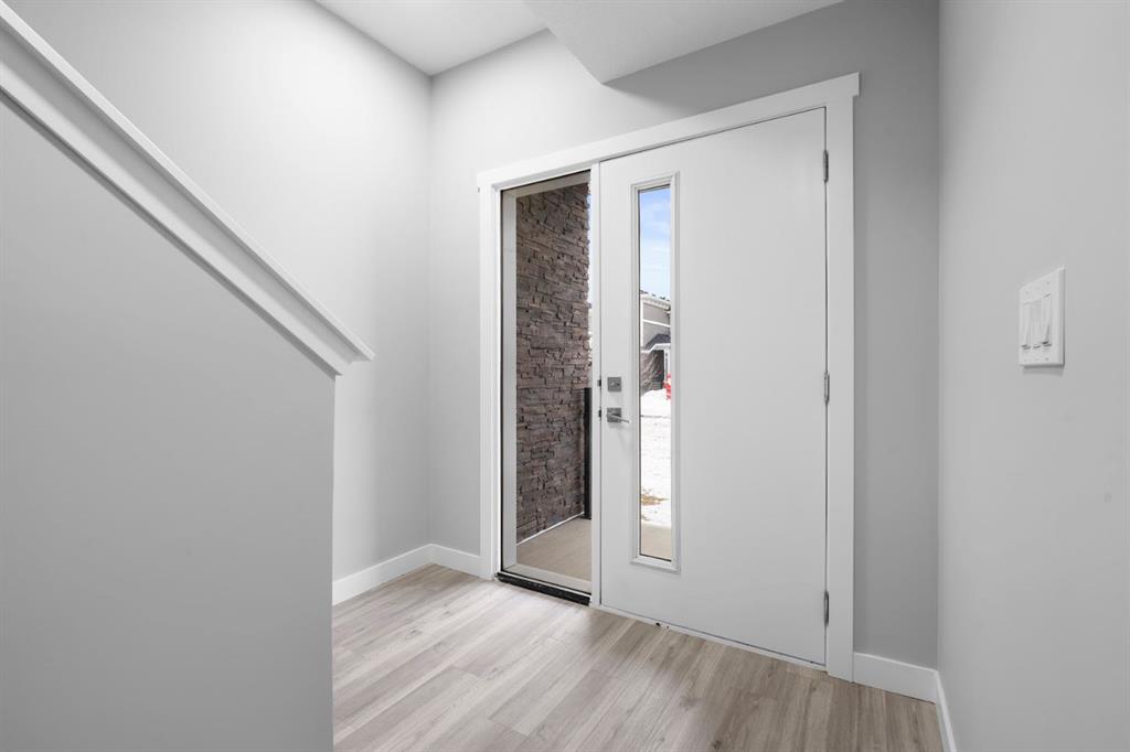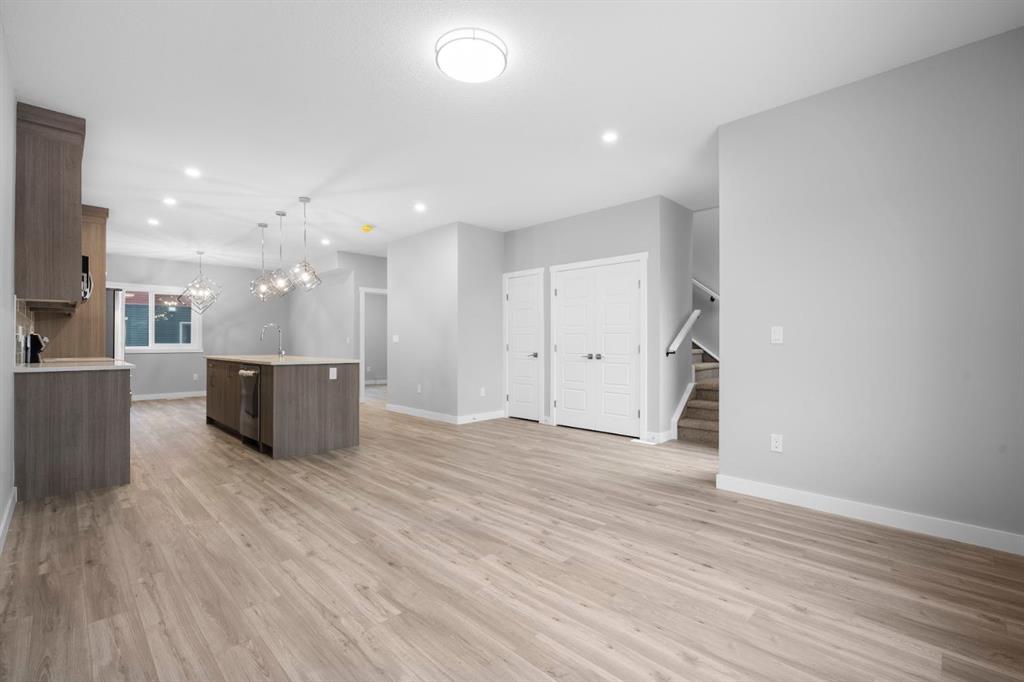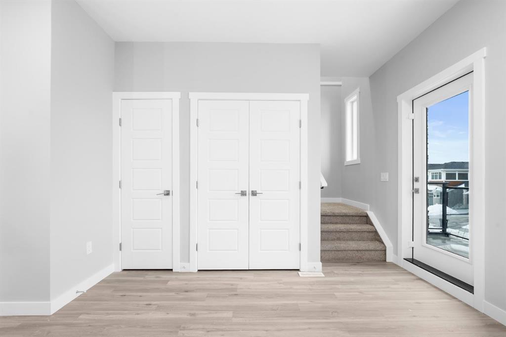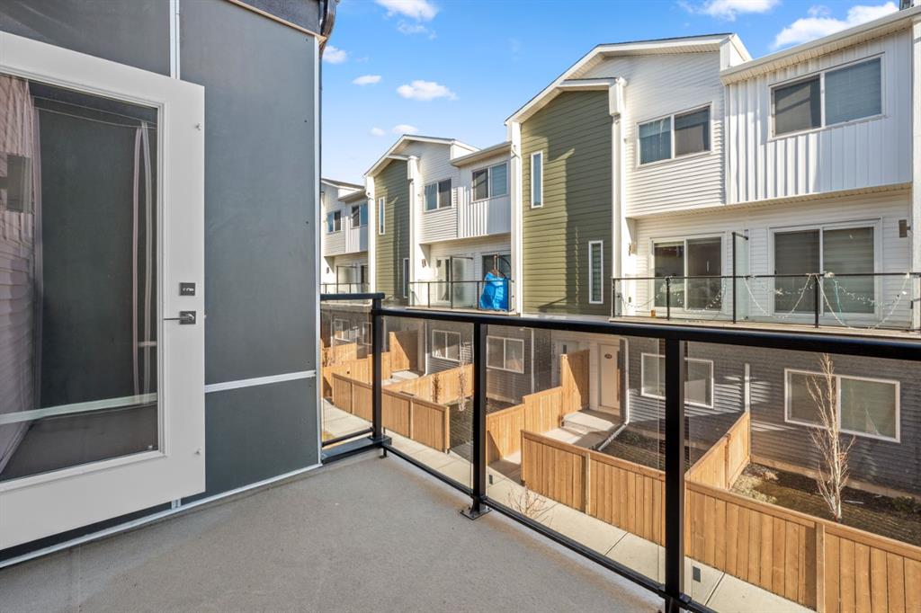 Welcome to this elegant brand-new 3-storey townhome with double attached garage, offering 4 bedrooms and 3.5 bathrooms in the desirable community of Redstone. Designed with upscale modern finishes, this home features quartz countertops, full-height glossy cabinetry, stainless steel appliances, soft-close drawers and cabinets, stacked front-load washer & dryer, and energy-efficient high-performance windows. A rare main-floor studio bedroom with wet bar and 4-pc ensuite provides an ideal private space for elderly family members, guests, or independent living. The open-concept second level showcases a chef-inspired kitchen with large island, pantry, dedicated dining area, home office/den with frosted French doors, and an expansive living room opening to an east-facing balcony, lighting, and privacy screen. Upper level includes a spacious primary suite with walk-in closet and ensuite, two additional bedrooms, full bath, and upper-floor laundry. Low condo fees, central greenspace courtyard, visitor parking, and quick access to Stoney Trail complete this exceptional offering. **Photos are of similar unit in the complex, all from the same floor plan, exterior & interior colors and layout may differ. Photos with furniture are virtually staged. Floor plans are attached in the supplements for this unit.