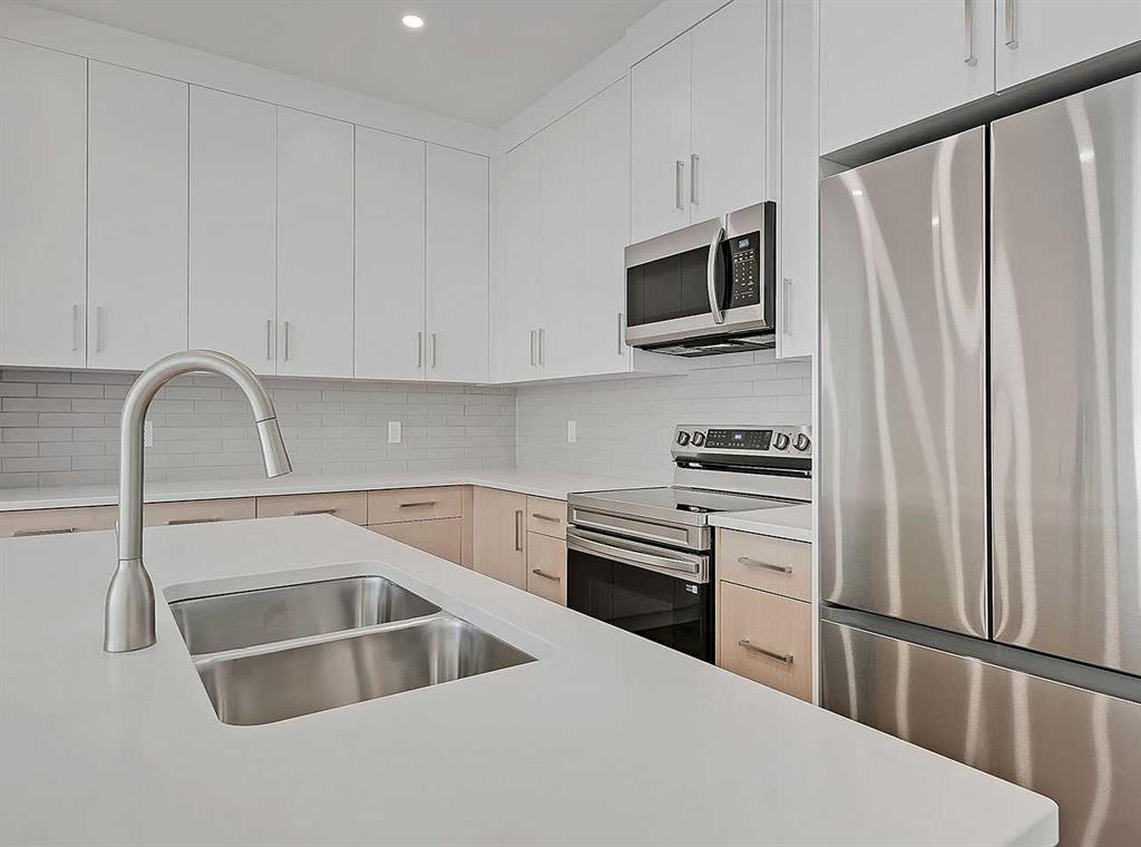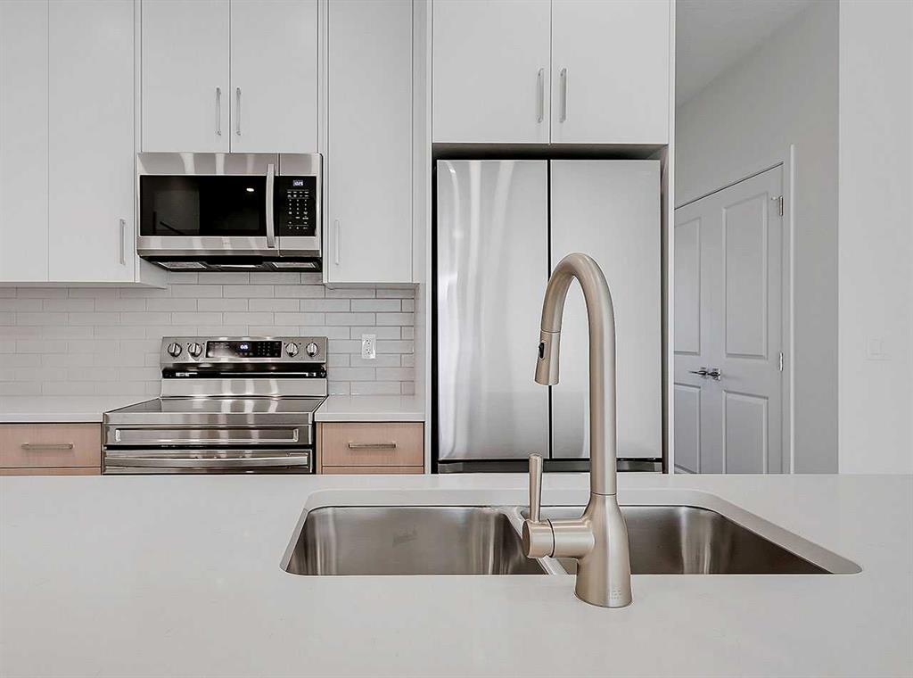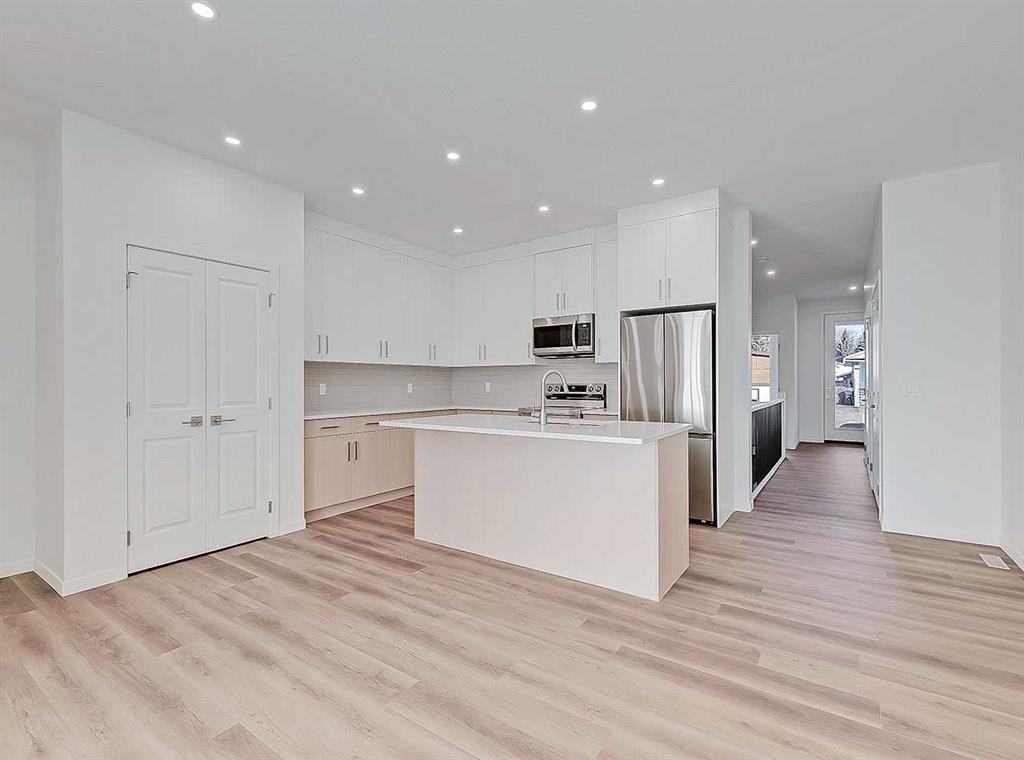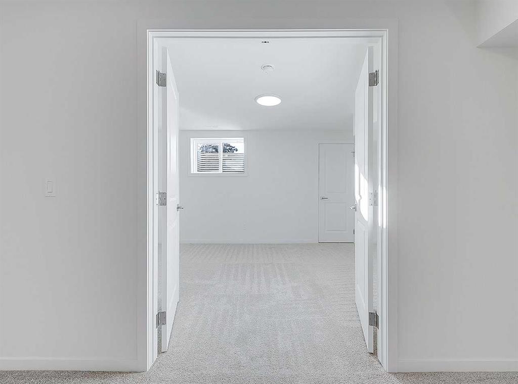 Inside, the home immediately impresses with elevated finish selections and a thoughtfully optimized layout designed for exceptional main-floor living. The stunning front entry features a custom-built railing, 9’ ceilings, an 8’ triple-pane door, and two walk-in closets offering ample storage. The chef-inspired kitchen showcases ceiling-height cabinetry locally crafted in Airdrie, all custom-made with soft-close technology, and paired with a fully upgraded premium appliance package. Timeless 3cm quartz countertops are featured throughout the home, creating a cohesive and elegant finish.