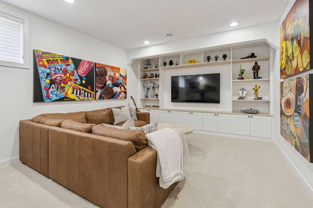 The FULLY FINISHED LOWER LEVEL offers additional living space with a spacious GREAT ROOM featuring a BUILT-IN MEDIA CENTRE designed by California Closets, a beautifully finished TILED WET BAR, a DEN ideal for a HOME OFFICE or FITNESS ROOM, and a FOURTH BEDROOM equipped with a FULL 3-PIECE BATHROOM, making it perfect for guests or growing families.