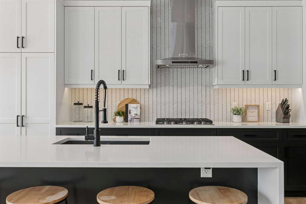 The beautifully designed main floor offers a modern OPEN-CONCEPT LAYOUT with WIDE PLANK LAMINATE FLOORING, a spacious front entry, and a bright living room centred around a cozy NATURAL GAS FIREPLACE with FLOOR-TO-CEILING STONE and a CUSTOM MANTLE.