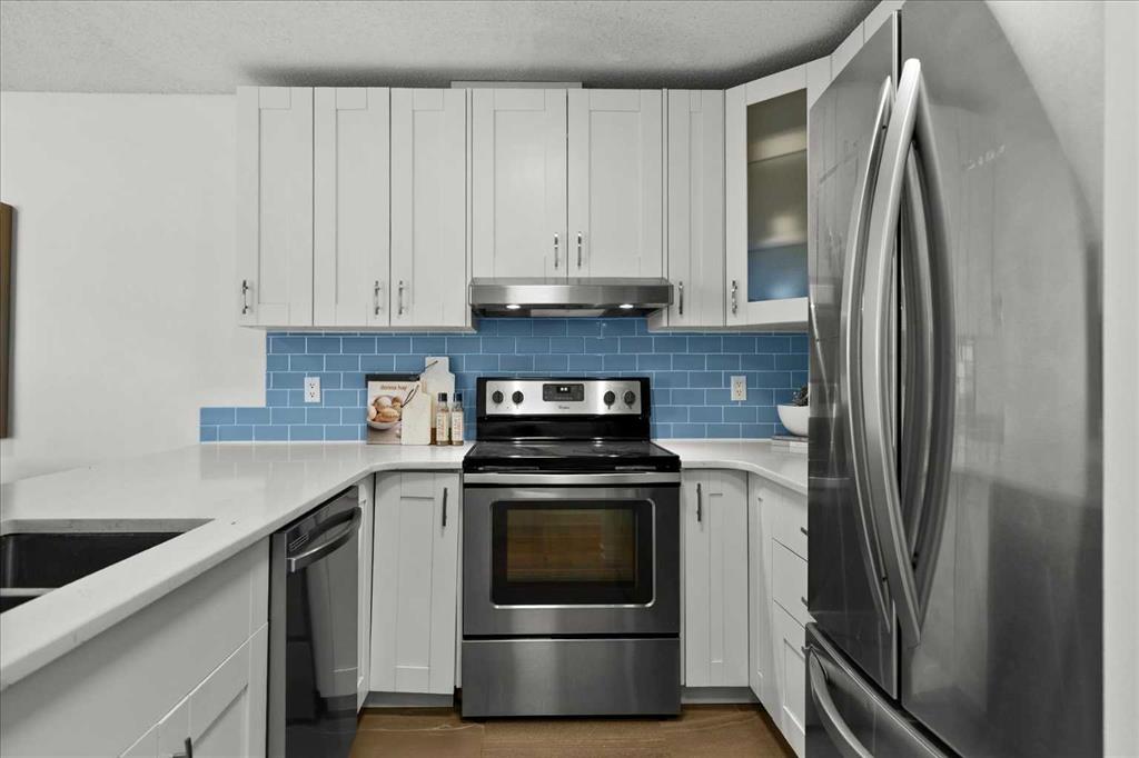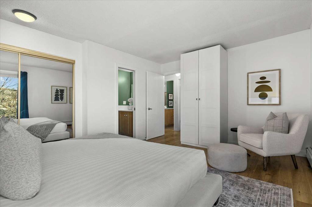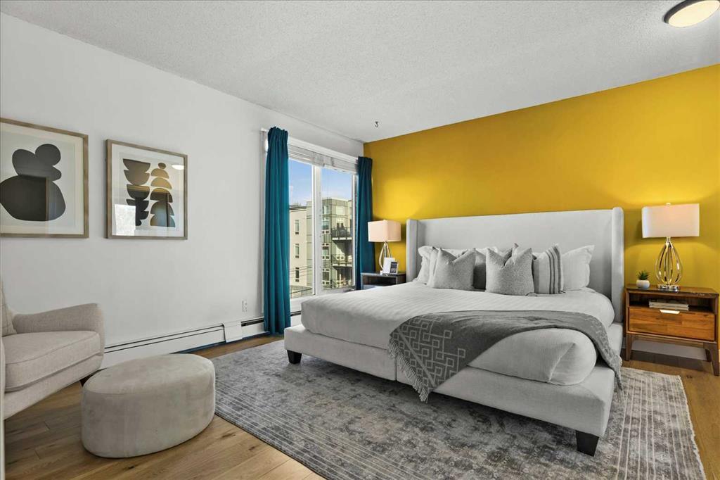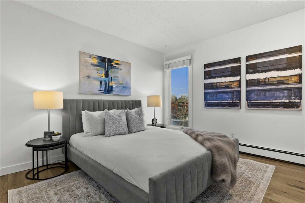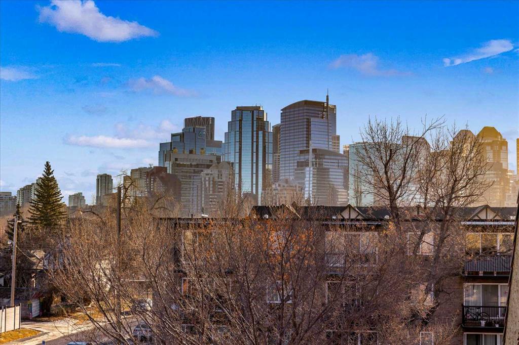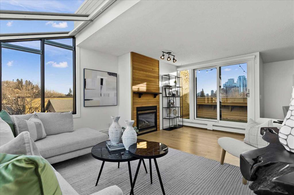 Are you looking for a bespoke condo in a premium location with a gorgeous view of downtown? What about nearly 1000sqf on the top floor with numerous renovations, a solarium and steps from the restaurants and shoppes of Kensington Village? Perched atop one of the most recognizable condo communities in Sunnyside, this corner unit home features in home storage, an updated kitchen with newer appliances (brand new dishwasher, washer and dryer) and quartz counters – all while being part of a micro community within one of Calgary’s top locations. The neighbours that call this development home are some of the best you will find and spend time outside in the summer sharing in laughs and memories. A well-managed complex of only 14 units – minutes to the Bow River and hop, skip and jump into downtown is exactly what you are looking for in 2026. In addition to being super transit accessible, the crown jewel of this home is the expansive living room highlighted by a gas fireplace, access to the SE facing patio with stunning downtown views, and a unique sunroom style windows that bathe the home in natural light. The primary suite easily fits a king size bed plus has room for a reading nook, additional closet storage and an ensuite bathroom. Another ample bedroom, 4-piece bathroom, in suite storage room, and an assigned parking stall complete this offering. Much of this home has been freshly painted and all was professionally cleaned right before listing, so it is READY for you and available for quick possession. The building also offers bike storage and a cedar sauna, undated roof and windows, and refreshed hallways. Come and have a look before She Gon’!