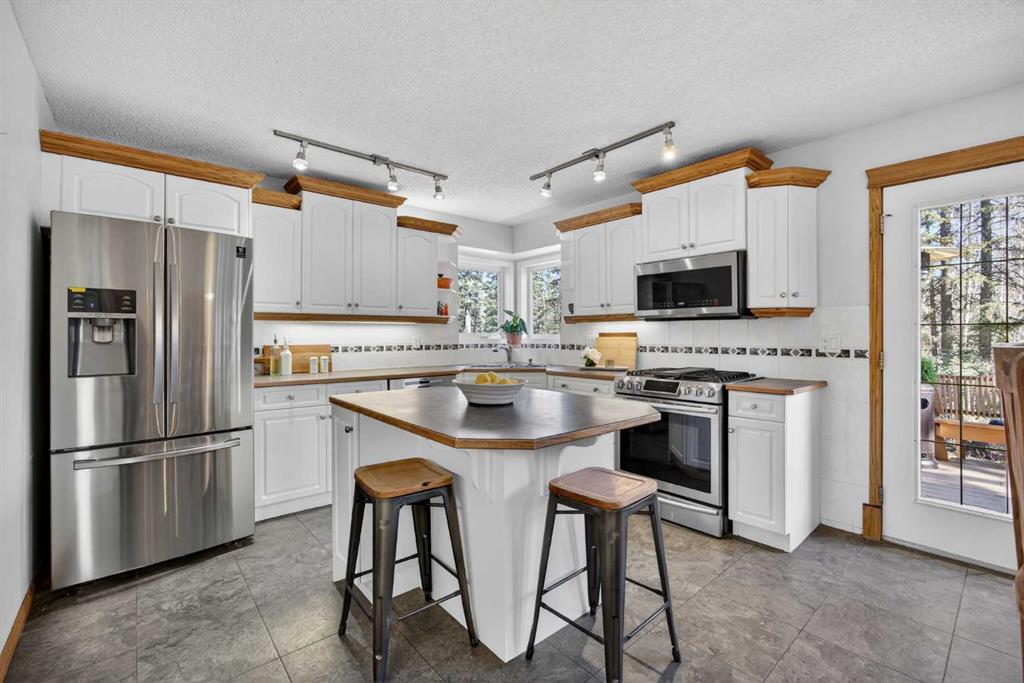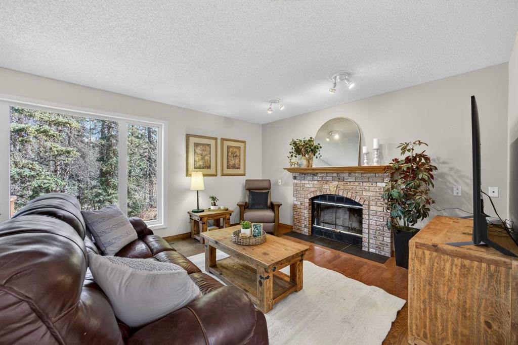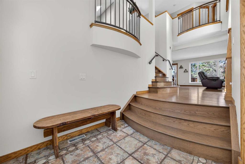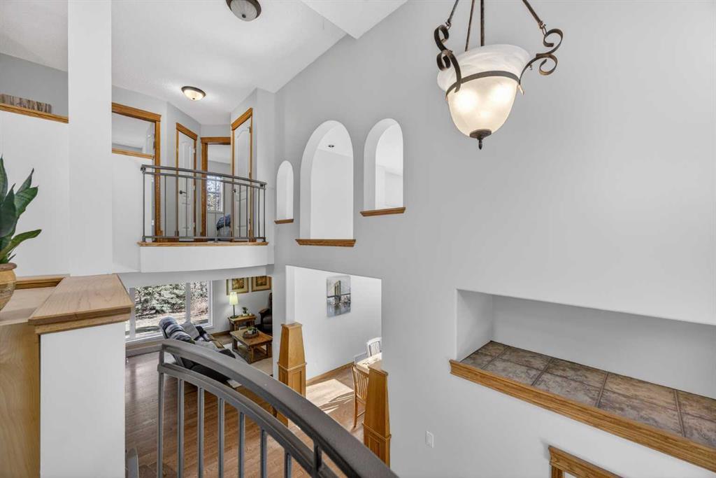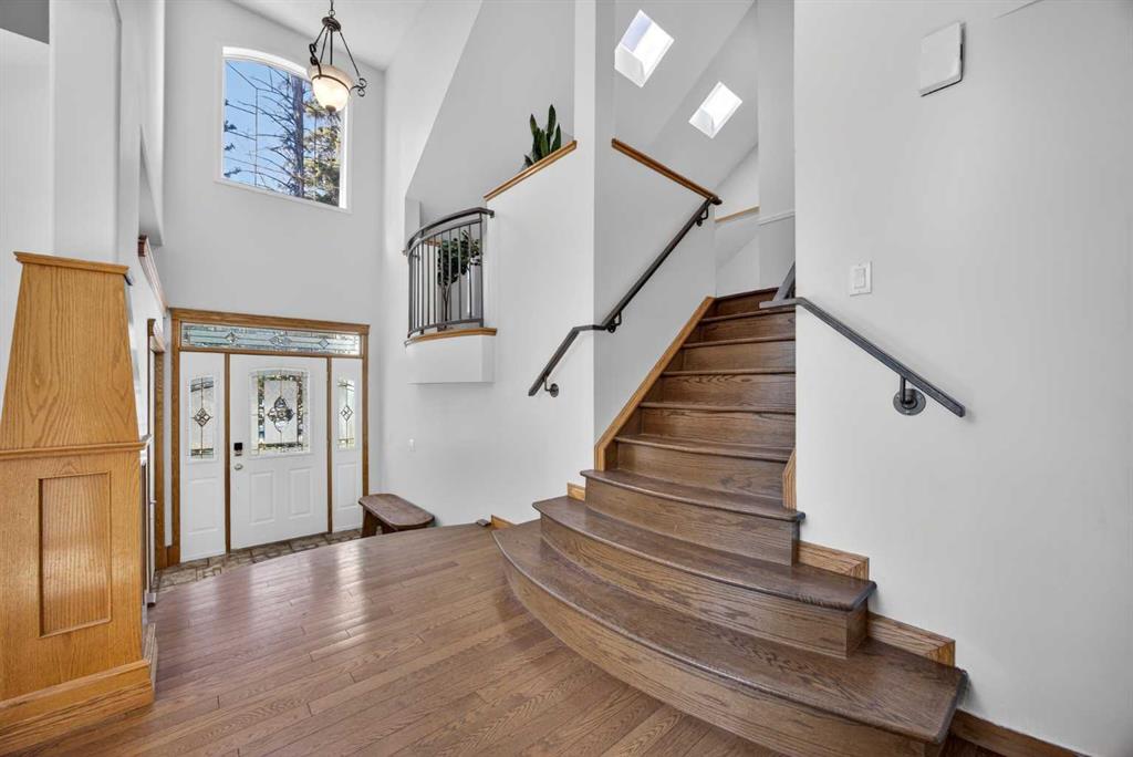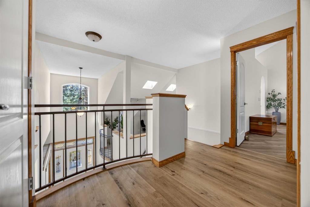 Step inside to a grand, light-filled entryway featuring soaring vaulted ceilings, elegant architectural details while your eyes are drawn to the stunning balconies above that capture the imagination. Arched windows…skylights…layers of Elegance! With rich hardwood floors and a beautiful brick-faced wood-burning Fireplace, the Living room flows seamlessly into the Kitchen and is framed by tranquil views of your expansive treed lot and surrounding wildlife. Windows and Skylights that capture the sunlight and beauty of nature create an ambiance of peaceful living and your own piece of paradise. The Kitchen is finished with gleaming white cabinets trimmed with natural wood. Built in display shelves and desk, a center island, and a corner sink that enjoys the views through two windows to the backyard. Upstairs, the home continues to impress with 3 bedrooms and a lofted, open-to-below design that enhances the sense of space and light. The primary suite is a peaceful retreat featuring vaulted ceilings, a walk-in closet, 4-piece ensuite including a jetted tub and glass shower beautifully designed with a glass block wall to bring in the light with your privacy in mind. This primary suite offers plenty of room to unwind. A bonus area completes this level and would make a perfect office or place for the kids to escape to with a conveniently located laundry room upstairs. The Basement level is fully finished with a 4th bedroom and 4-piece ensuite with heated floors. Family room, flex space and ample storage. This home offers Multiple living areas ideal for families or entertaining. Let’s not forget about the TRIPLE CAR GARAGE, attached, with plenty of room for vehicles, toys, or workshop space. Step out onto the multilevel deck to enjoy and relax for an evening BBQ and morning coffee. Round the corner and step up to the upper levels with a convenient side entry/mudroom access or even hot tub access one day. The backyard has plenty of space to enjoy the natural surroundings. Making memories in your backyard is easy with the firepit, large trees, garden. No need for camping when you can experience it in your yard. This is an opportunity to live the dream, removed from the city, yet still within a short drive to take advantage of the conveniences the City has to offer.