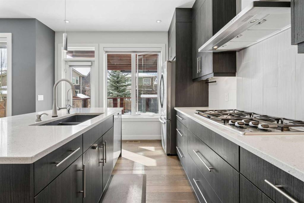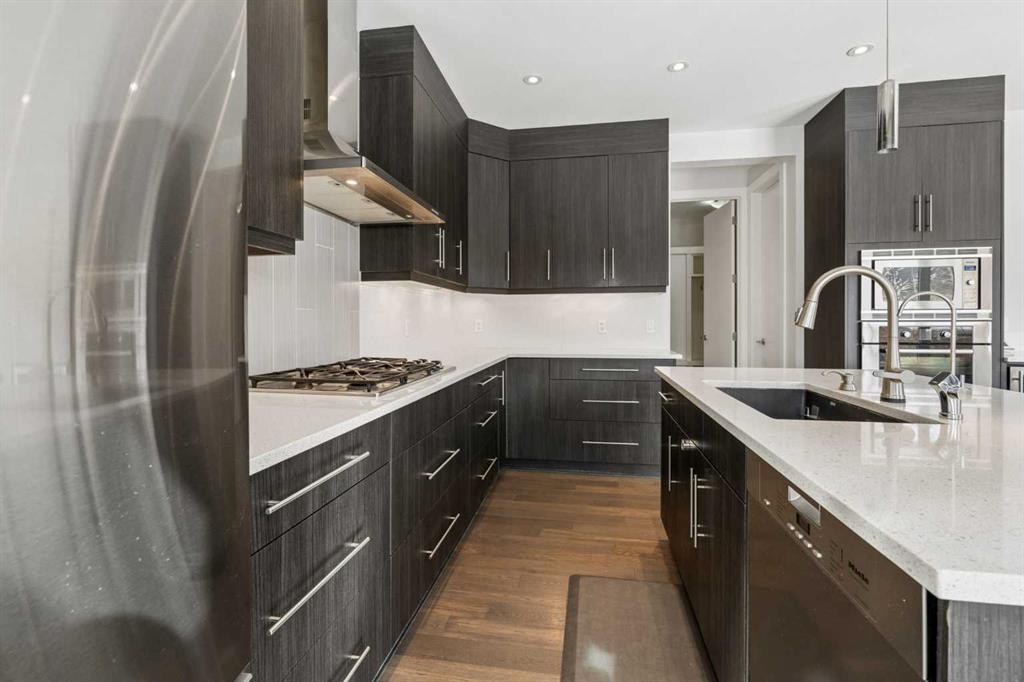 Beautifully positioned on a quiet crescent in Aspen Dale, this exceptional family home offers approximately (3,490) sq ft of refined living space across three fully developed levels. Built by Crystal Creek Homes, the residence features 4+1 bedrooms, an ideal layout for families, and is move-in ready. With its desirable east/west orientation, the home is filled with natural light from morning to evening, creating a warm and inviting atmosphere. The main level showcases 9’ ceilings, wide-plank hardwood flooring, designer lighting, custom window coverings, and quartz countertops throughout. The chef-inspired kitchen is the heart of the home, complete with a large central island with breakfast bar, stainless steel appliances, gas cooktop, and wall oven. A bright dining area overlooks the backyard, and a private home office provides the perfect work-from-home space. Upstairs, the spacious primary retreat (over 200 sq ft) features a luxurious 5-piece ensuite with quartz finishes and a generous walk-in closet. Three additional bedrooms—each with their own walk-in closets—share a well-appointed 5-piece bathroom. The fully finished lower level expands your living space with a large recreation and games area, a stylish wet bar with bar fridge, a dedicated fitness space, a fifth bedroom, and a full bathroom with heated floors—ideal for guests or extended family. Outdoors, the beautifully landscaped yard offers multiple spaces to relax and unwind. Enjoy your morning coffee on the private front porch, and take advantage of the west-facing backyard with mature trees—perfect for sunny afternoons, evening gatherings, or children at play. Completing the package is an exceptional location—just a short drive to Rundle College, Westside Recreation Centre, and the 69 Street CTrain Station, and close to downtown. It also offers quick access to Webber Academy and the amenities at Aspen Landing Shopping Centre, plus convenient routes for weekend escapes to the mountains. Discover this home—schedule your private viewing today.