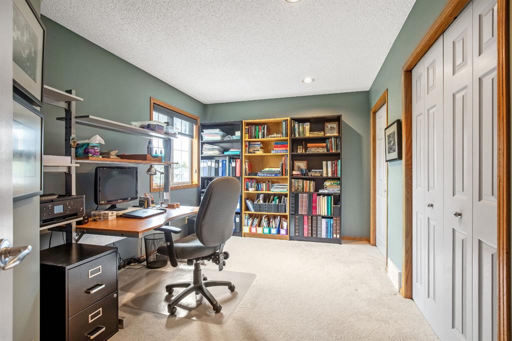 The adjoining living room invites you to unwind with its floor-to-ceiling tiled corner gas fireplace, built-in bookcases, and custom media cabinetry, while the front dining room offers an elegant space for family gatherings. A main floor office/den provides flexibility for work or study, and the thoughtfully designed mudroom ensures seamless organization from the oversized (23′ x 23′) double attached garage.