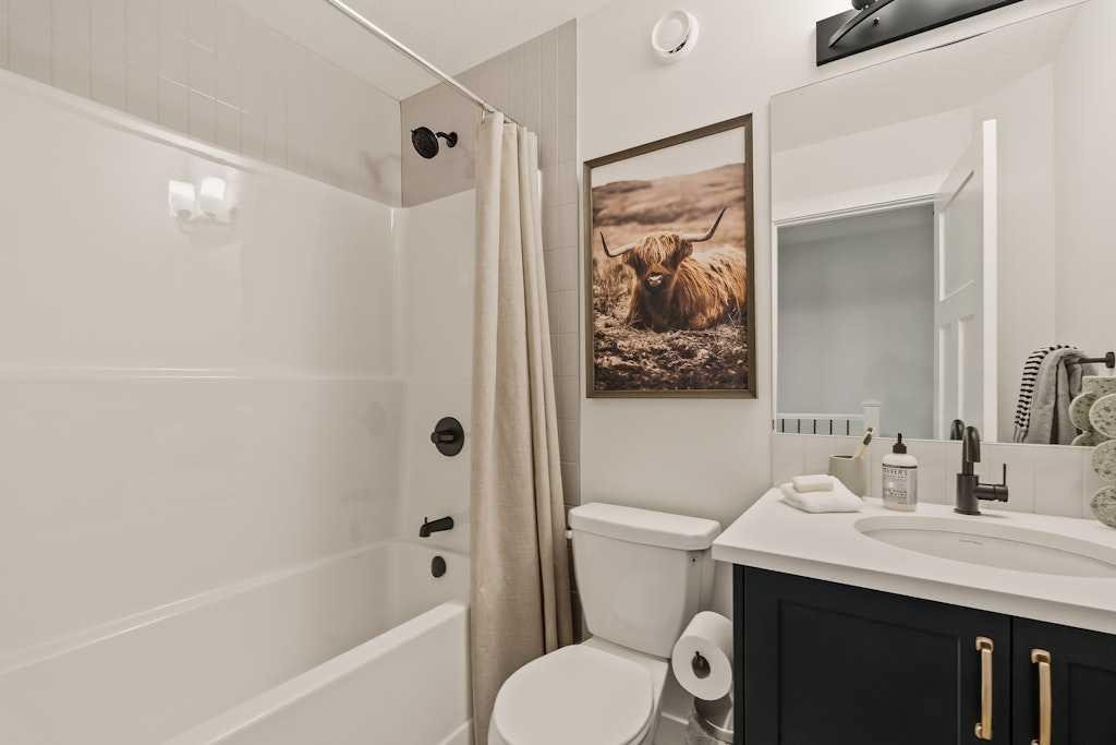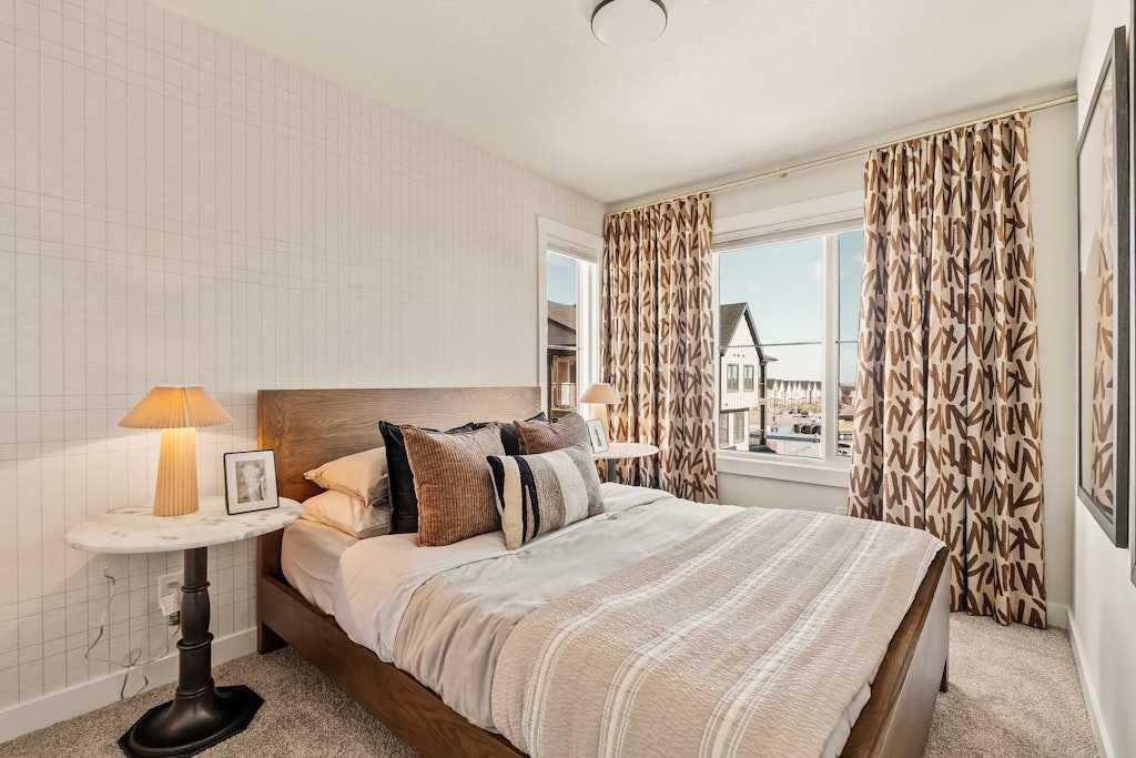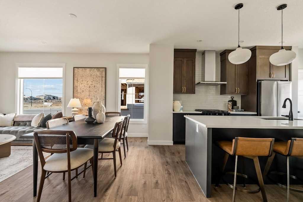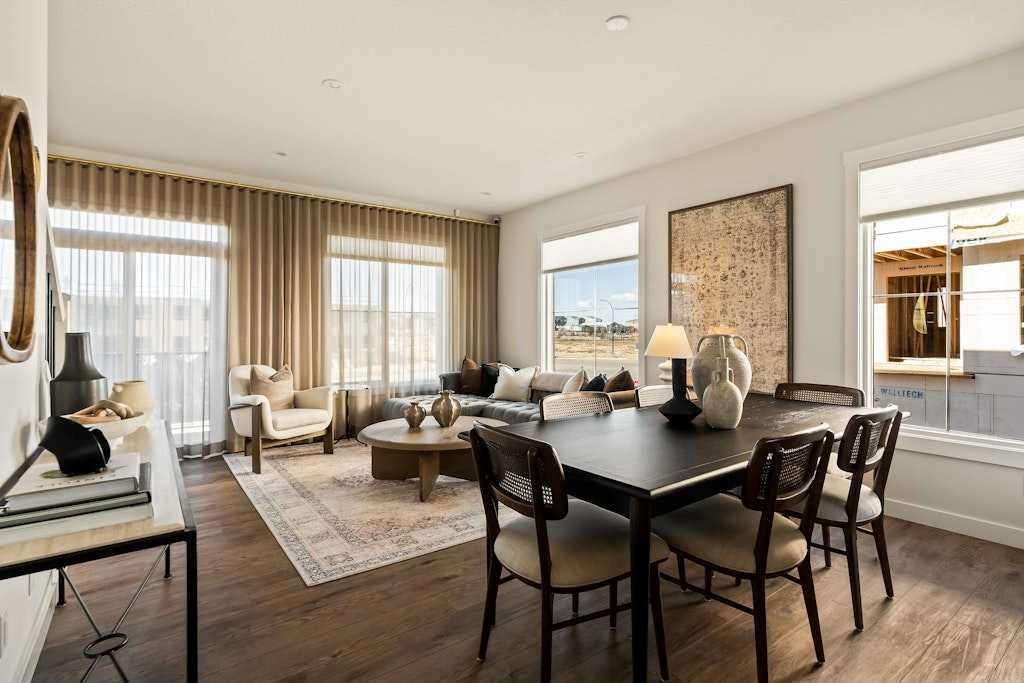 The brand new ‘Holiday’ model by Brookfield Residential is now available for immediate possession in the vibrant community of Livingston! This brand-new END-UNIT townhome blends contemporary design with everyday functionality, offering over 1,400 sqft, 3 bedrooms, 2.5 bathrooms, a ground-floor flex/office space, and a private double attached garage – all in one of north Calgary’s most desirable master-planned neighbourhoods. The open-concept main floor showcases a timeless kitchen featuring full-height cabinetry, elegant quartz countertops, a built-in hood fan and microwave, and a premium stainless-steel appliance package. The oversized island with pendant lighting provides the perfect place for casual dining or entertaining. The kitchen flows seamlessly into the bright living and dining areas, highlighted by a wall of windows that flood the space with natural light. Enjoy extra windows and additional natural light – a perk of owning the end-unit townhome! Step out onto your private East-facing balcony overlooking the green space – ideal for summer BBQs or a morning coffee while providing optimal sunshine all year long. A large laundry room with additional storage and a convenient 2-piece powder room complete the main level. The upper level features a spacious ~11’ x 12’ primary suite which includes a walk-in closet and a private ensuite with walk-in shower, offering a relaxing retreat at the end of the day. Two additional bedrooms and a full bathroom complete the upper floor, providing plenty of room for family, guests, or a home office. On the lower level, a versatile den off the entryway and private double attached garage offers endless flexibility – the perfect space for a home office, gym, or creative space. The private double attached garage keeps your vehicles warm and secure all year long. This home includes numerous upgrades such as central A/C rough-in, a BBQ gas line + gas line to the kitchen range, 42” upper cabinets, and an enhanced interior selections package. Backed by both Brookfield’s comprehensive builder warranty and Alberta New Home Warranty, this property offers complete peace of mind. Set in Livingston, a dynamic north Calgary community known for its impressive Homeowners Association, state-of-the-art Hub facility, parks, playgrounds, and convenient access to major routes – this is the perfect place to call home. If you’re looking for a low-maintenance townhome that combines style, functionality, and quality craftsmanship – welcome to the Holiday by Brookfield Residential in Livingston. *Please note: Photos are for representation purposes only, and exact finishes may vary.