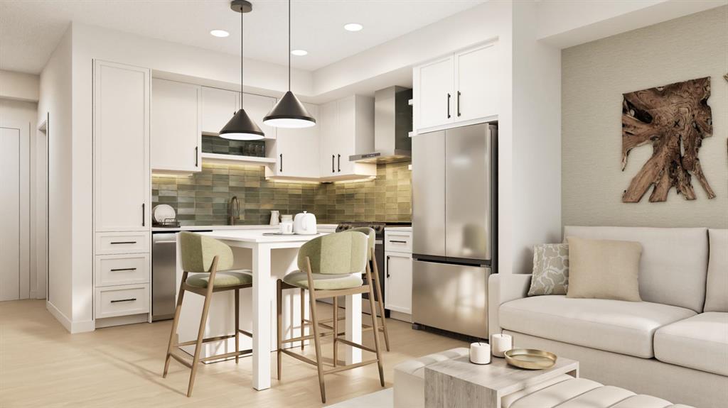 FIRST TIME HOME BUYERS NEW HOME GST REBATE AVAILABLE!! Smart, stylish, and exceptionally versatile, Unit B at Metro One is designed for modern living. This 1-bedroom + den layout offers the perfect balance of function and flexibility—ideal for urban professionals, remote workers, and lifestyle-focused buyers seeking a space that adapts to their needs. Inside, the thoughtfully designed interior features a contemporary L-shaped kitchen complete with a full island and a built-in table—perfect for casual dining, working from home, or entertaining guests. A sleek cabinet-style pantry keeps everything organized without sacrificing space, while the bathroom includes a practical tower linen cabinet for added storage. The spacious den provides incredible flexibility, easily transforming into a dedicated home office, guest room, or creative studio. Paired with air conditioning for year-round comfort and a terrace-level balcony for seamless indoor-outdoor living, this home delivers both convenience and comfort in every detail. Whether you’re enjoying your morning coffee outside or hosting friends in your open-concept living space, Unit B is designed to support your lifestyle. Inside every home, professionally curated interior collections—crafted by an experienced design team with six distinct styles to choose from, you can select a look that reflects your personal taste without the added cost or stress of upgrades. At Metro One, style truly comes standard. Located within the thoughtfully planned Metro One development, residents benefit from contemporary architecture, quality construction, and beautifully landscaped surroundings. The community is designed with connection and convenience in mind, offering easy access to nearby shops, restaurants, transit, and recreational amenities. Positioned for both lifestyle and location, Metro One offers quick access to Stoney Trail and is surrounded by natural beauty. The protected Priddis wetlands lie just to the east, while the foothills and Rocky Mountains are only a short drive west—making it easy to enjoy both urban convenience and outdoor adventure. Developed by Cardel in the master-planned community of Silverton, Metro One represents a smart investment and a vibrant place to call home.