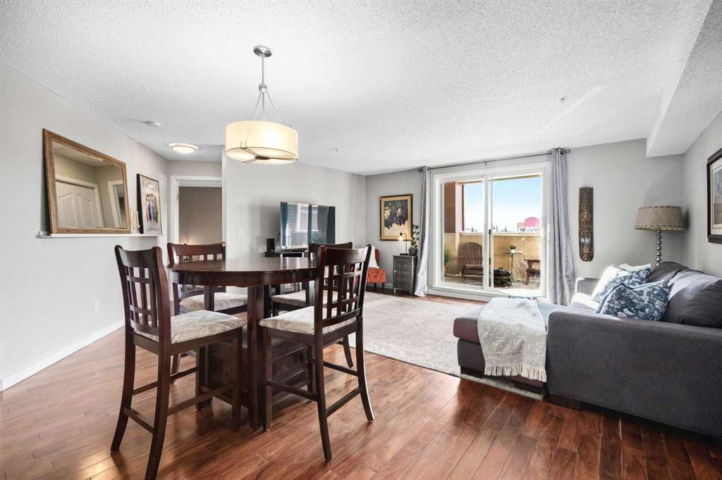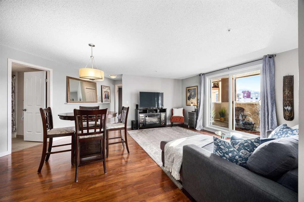 Welcome to one of the largest and most desirable units in this centrally located downtown Cochrane complex! This beautifully maintained 2 bedroom, 2 bathroom condo offers an exceptional open concept layout with stunning hardwood flooring and a bright, functional living space perfect for both everyday living and entertaining. The updated kitchen features quartz countertops, modern finishes, and a brand new dishwasher, flowing seamlessly into the spacious dining and living areas.