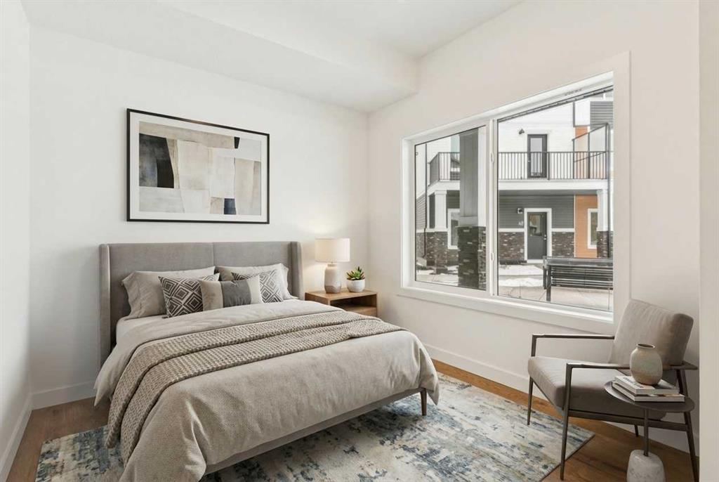 The main living level is bright, open, and made for entertaining. A spacious living room flows seamlessly into the dining area and contemporary kitchen, complete with stainless steel appliances, sleek quartz countertops, and clean modern finishes. Step out onto the oversized balcony to enjoy sunshine and views of the courtyard.