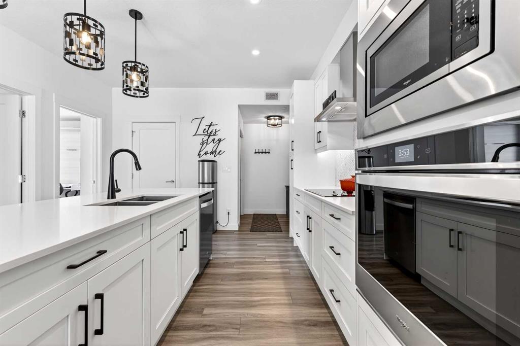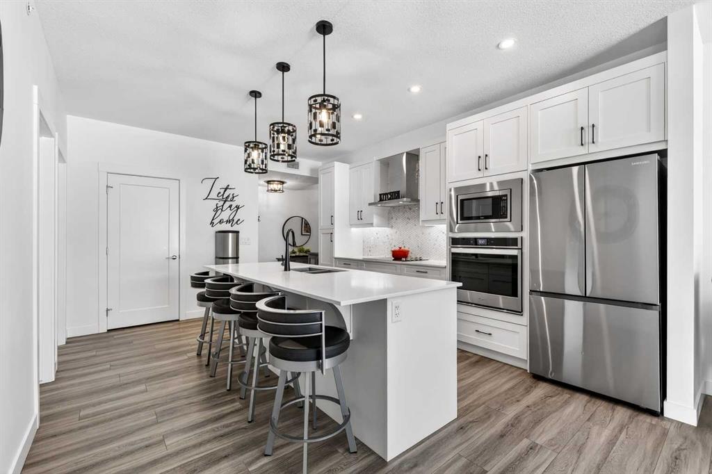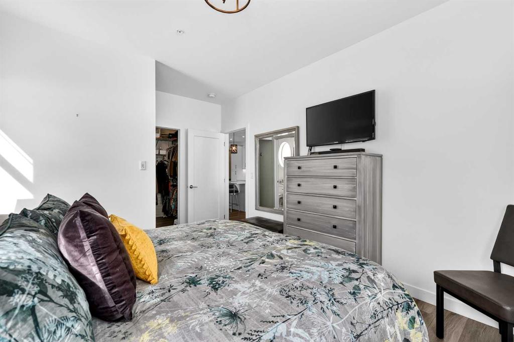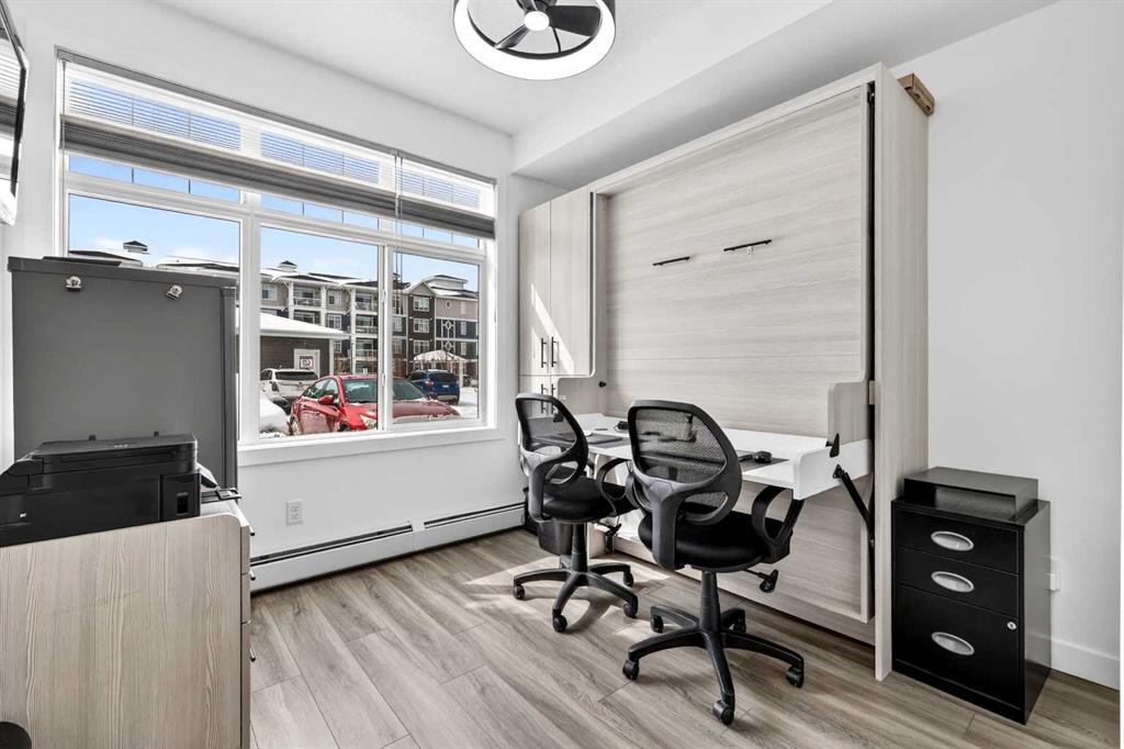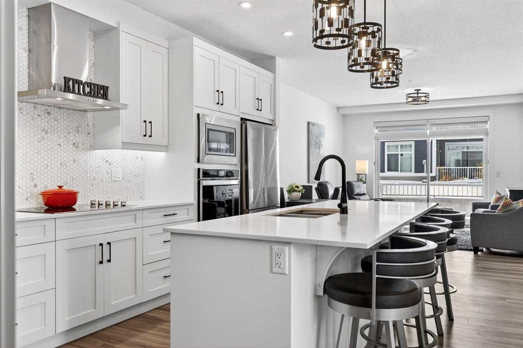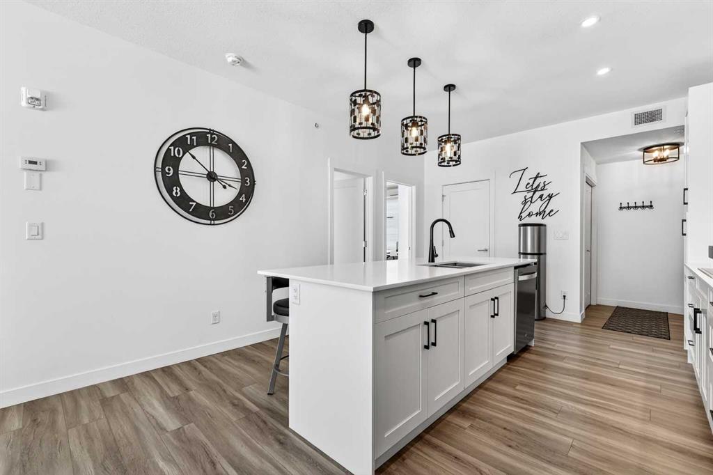 Auburn Rise is a newer built condo building built by Logel Homes in the amazing south-east Calgary community of Auburn Bay. Large size, upgrades and special features make this unit one of the better condos buys available right now. A titled tandem underground parking stall guarantees you can keep two vehicles safe and warm. From there you can either take the very short climb up one flight of stairs directly adjacent to your stall right to this ground floor unit or take the buildings elevator as intended. Situated on the south west corner of the 400 building this home gets plenty of natural light and warmth yet keeps cool inside in the summer with air conditioning already in place. The 958 square foot Atwood plan is well laid out with 9-foot ceilings, an attractive modern color scheme and numerous upgrades at the time of building including LVP flooring and tile throughout the home (no carpets), plumbing fixtures, closet organizers, pot lights, 41-inch upper cabinets, cabinet drawers, upgraded appliances, dual ensuite sinks, pot lights and more totaling over $25,000. More was done after building including all light fixtures and window coverings. The lichen is anchored with a large quartz island which seats 4 comfortably. There is a 25-foot deck for enjoying the outdoors and a newer building which you will be proud to call home. Ample visitor parking right outside this building and a center green space add to the aesthetics of this desirable complex. There are many grocery stores, restaurants and other shopping amenities right in the area within very short walking distance. The 302 BRT bus line stops right outside, biding the time until the green line LRT makes its way down here. You also get access to enjoy the private Auburn Bay Lake year-round recreation area and numerous pathways and green spaces in the community. All this and easy access to both Deerfoot and Stoney Trail to get you where you need to go. Come and see for yourself today!