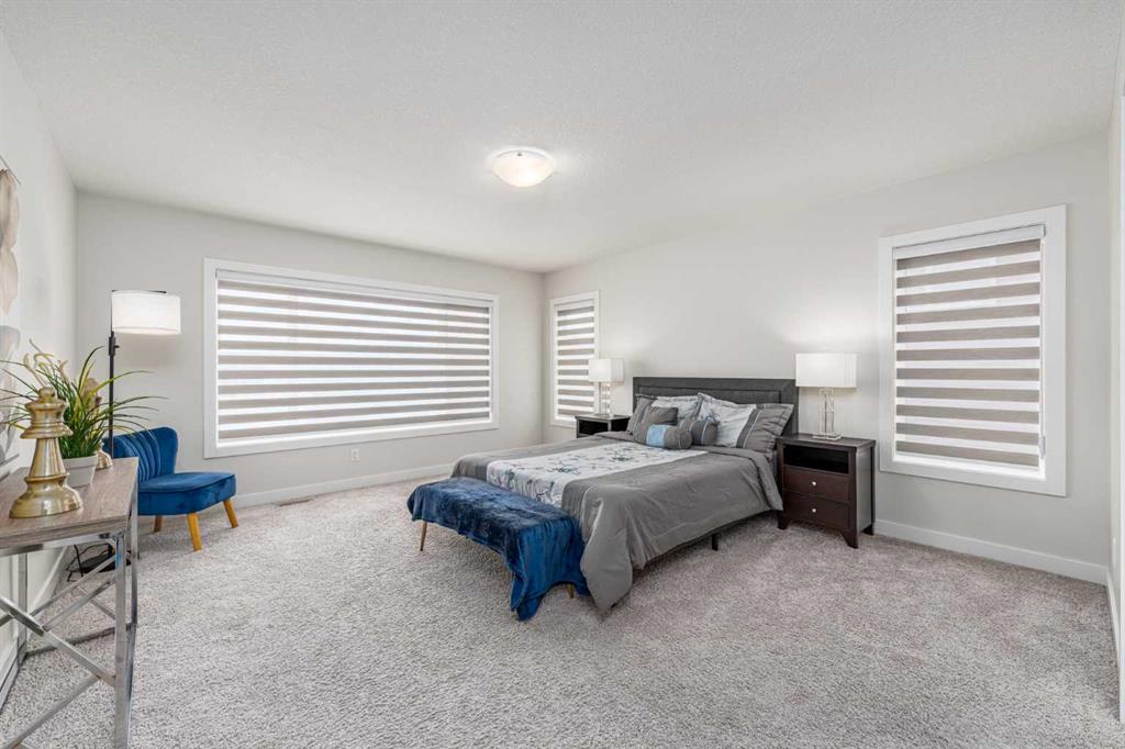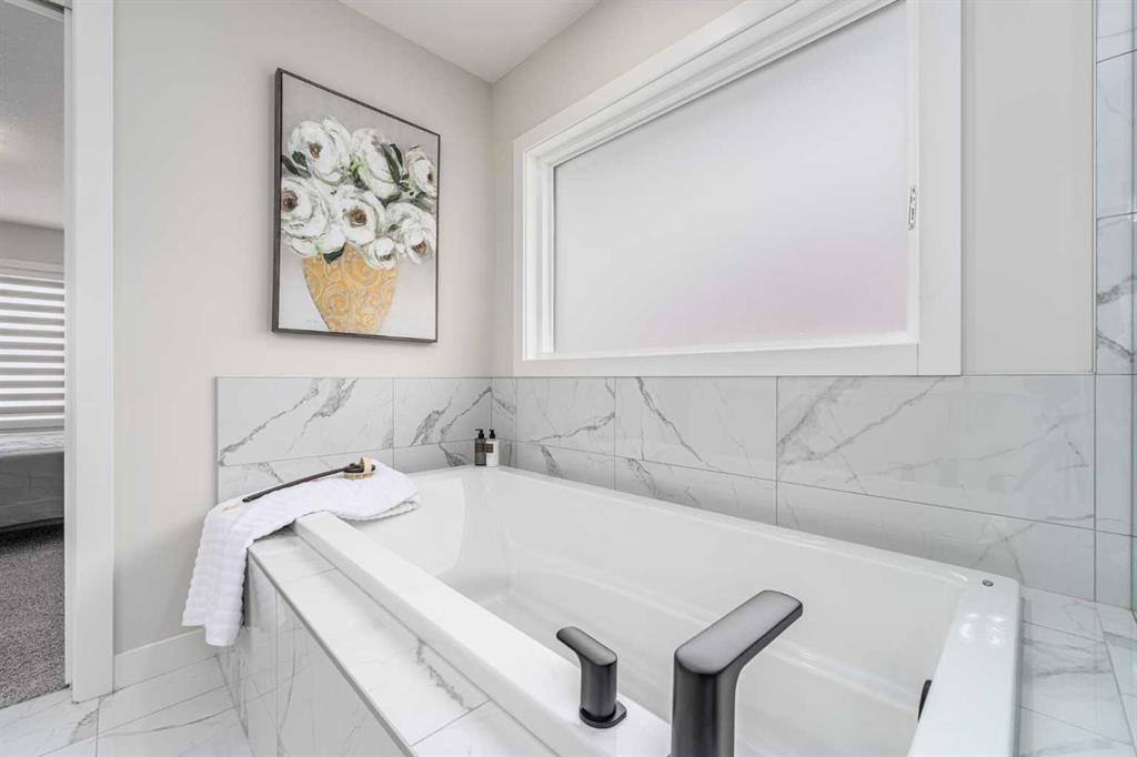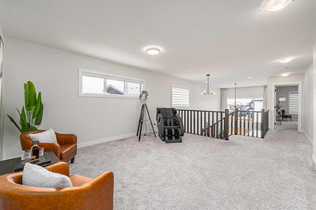 Upstairs, elegant wooden spindle railings overlook the stunning open-to-below living space, enhancing the home’s sense of openness. The spacious bonus room is bright and versatile, with a direct view of the high ceiling below—perfect as an entertainment or family space. The primary bedroom is filled with natural light, featuring one large window along with two additional upgraded picture windows, creating a bright and inviting retreat, complete with modern zebra blinds. The luxurious ensuite includes a double vanity, a relaxing soaker tub, and an upgraded glass shower, complemented by a generously sized walk-in closet. Two additional bedrooms are both bright and thoughtfully designed with extra windows, and they share a clean, well-appointed bathroom. The upper-level laundry room is impressively spacious and includes a sink for added convenience.