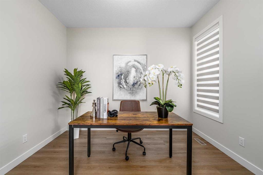 The main floor impresses with 9-foot ceilings and upgraded 8-foot interior doors throughout, creating a grand and airy atmosphere. The stunning 17-foot living room is filled with natural light and features a cozy gas fireplace, along with custom motorized blinds for effortless comfort and convenience. The modern kitchen is truly the heart of the home—featuring full-height cabinetry, a massive island, built-in oven and microwave, and a sleek, upscale color palette accented by black hardware, faucet, and sink. A bright main floor office with a window offers the perfect work-from-home setup, complete with a stylish barn door upgrade. A convenient powder room completes this level. Step outside to a professionally finished backyard featuring a fully permitted deck, ready for summer entertaining.