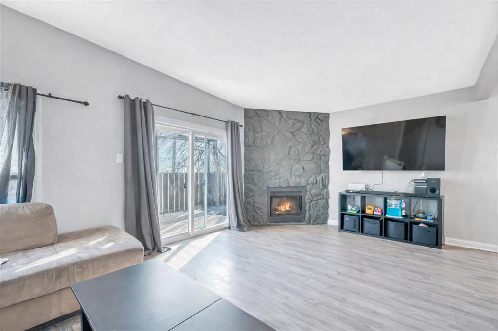 The main level features a bright living room highlighted by a cozy wood-burning fireplace and large windows that bring in plenty of natural light. Just steps away, the kitchen and dining area offer a practical layout with ample cabinetry, stainless appliances, and space for everyday meals or casual gatherings. A convenient 2-piece bathroom completes the main floor.