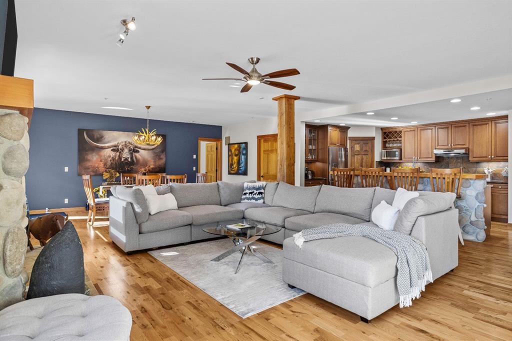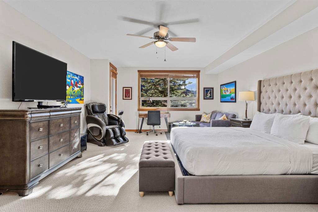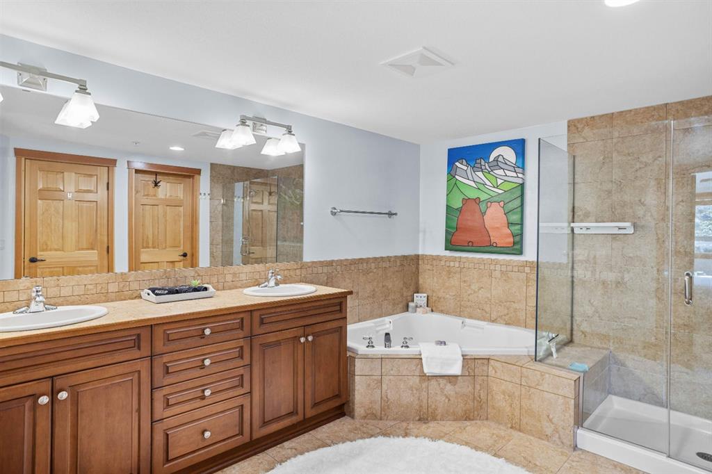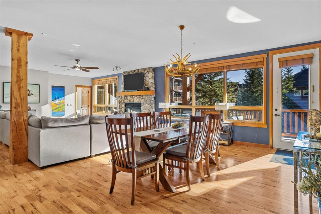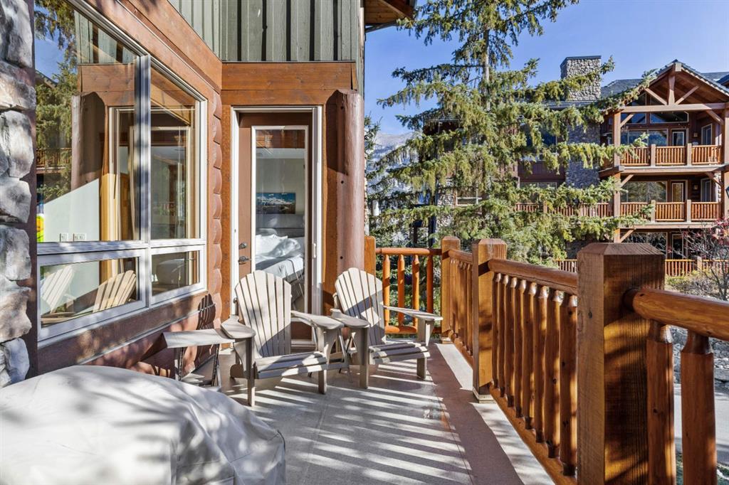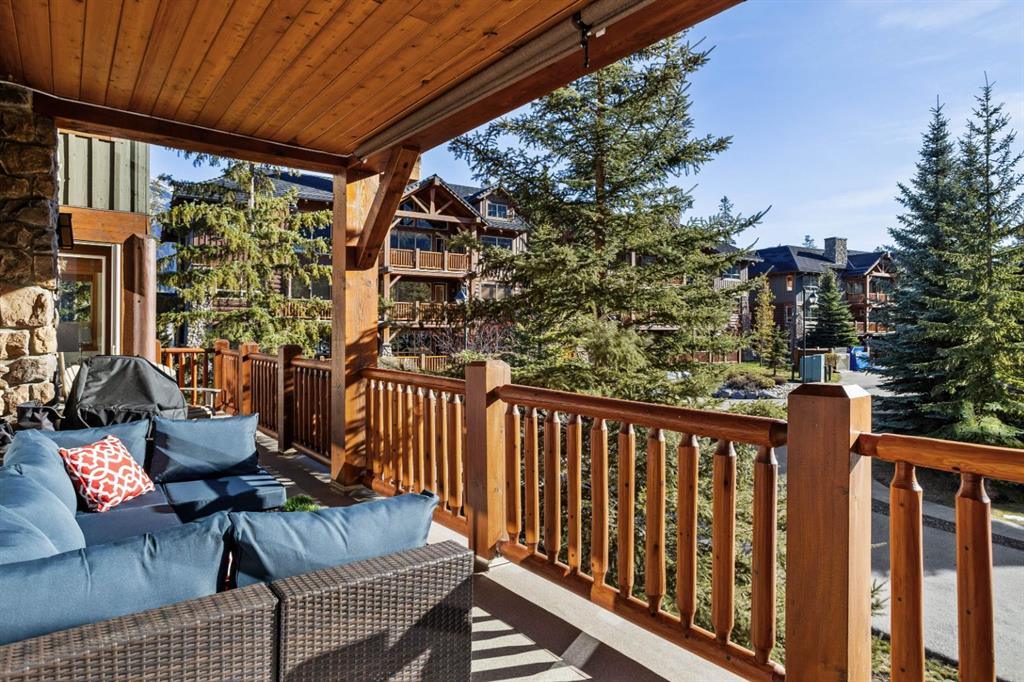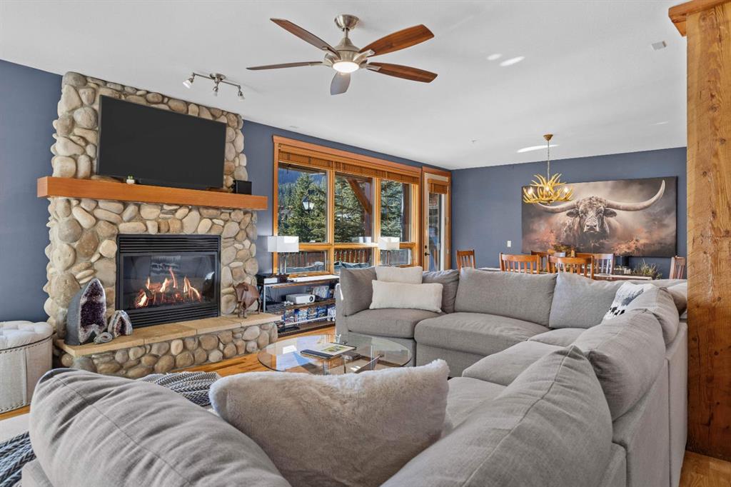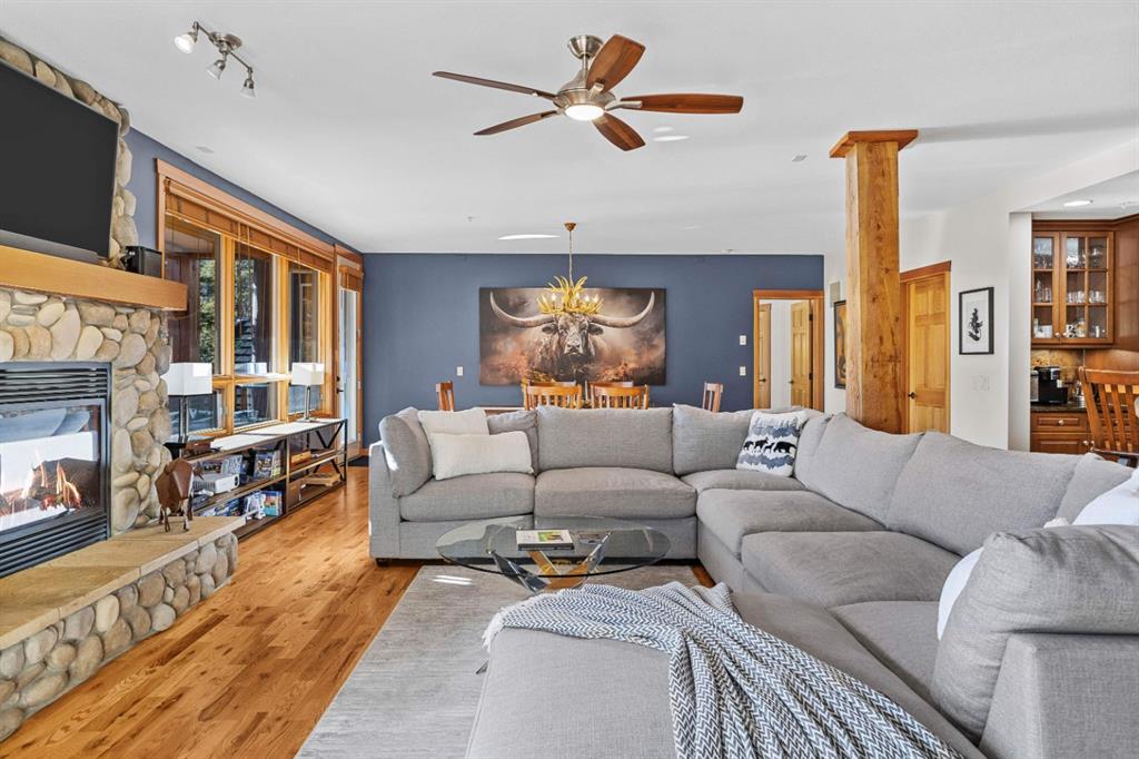 Experience the best of mountain living at this stunning 3-bedroom, 3-bathroom, single level condo in Trailside Lodges. Spanning over 2000SF, this property offers breathtaking, Southeast-facing mountain views, an abundance of natural light, and a seamless blend of comfort and style. You feel the warmth and spaciousness here from the moment you step inside this beautiful open-concept living area with floor-to-ceiling stone fireplace and beautiful hardwood flooring. The gourmet kitchen features high-end finishes, generous counter space, and lots of cupboards, ideal for culinary enthusiasts. The primary suite is a fabulous private retreat with space for a lounge area, direct deck access, and a large ensuite with a corner jetted tub, double vanity, spacious shower, water closet and walk-in closet. A second master suite also boasts direct deck access, a walk-in closet, and another elegant ensuite with double vanities. The third bedroom, tucked away for privacy, enjoys its own unique mountain views with a third full bathroom nearby. An oversized laundry room with additional flex space add to the home’s thoughtful design and offer tons of storage room. Enjoy outdoor living year-round on the impressive 35′ x 9′ partially covered deck, complete with a roll-down sunshade and patio heater, providing a comfortable space to take in the incredible mountain vistas. A number of recent upgrades have been completed, including new appliances, new kitchen sink/faucet, new toilets, & a murphy bed. Ownership at Trailside Lodges includes access to one of the best-outfitted clubhouses in Canmore, with hands down, the best outdoor hot tub with unbelievable panoramic views, an indoor resistance pool, a well-equipped fitness center, billiards & games loft, and a theatre room. Additional conveniences include a heated underground parking stall, storage for all your seasonal gear, and ample guest parking. This home is move-in ready and offers the perfect lock-and-leave lifestyle without compromising space or luxury.