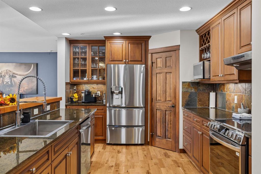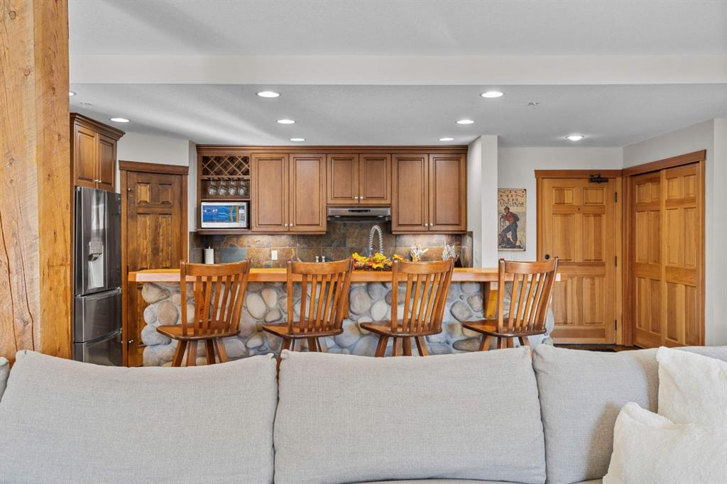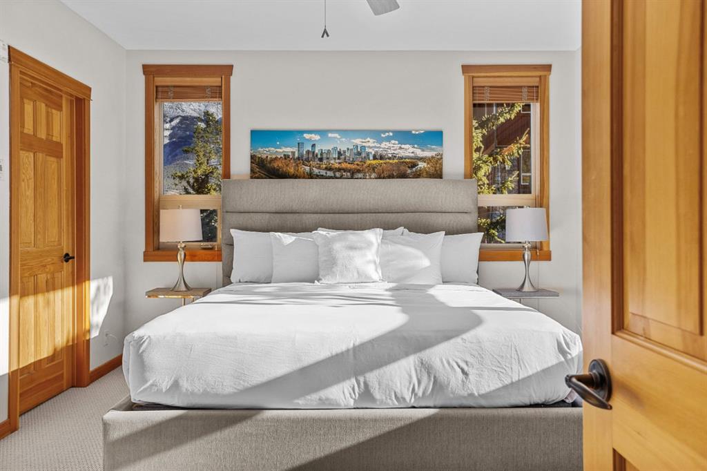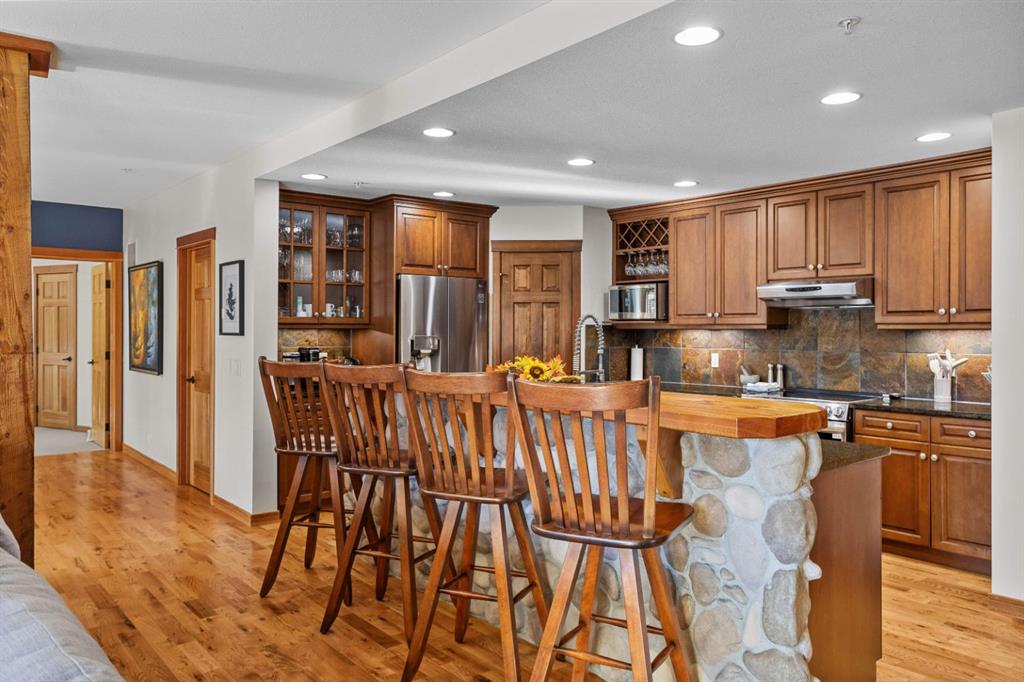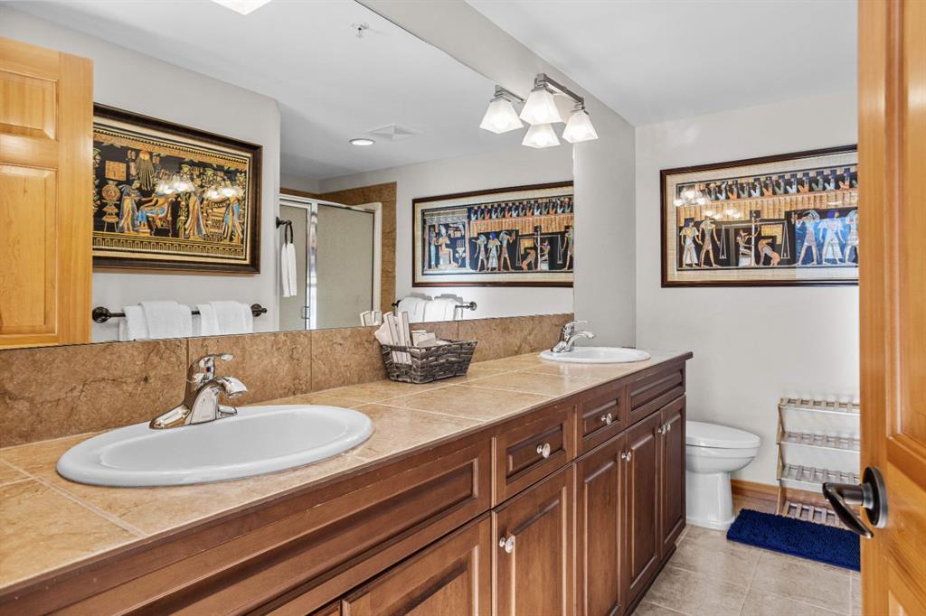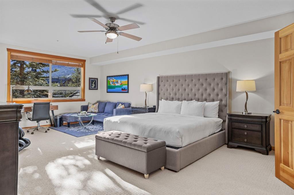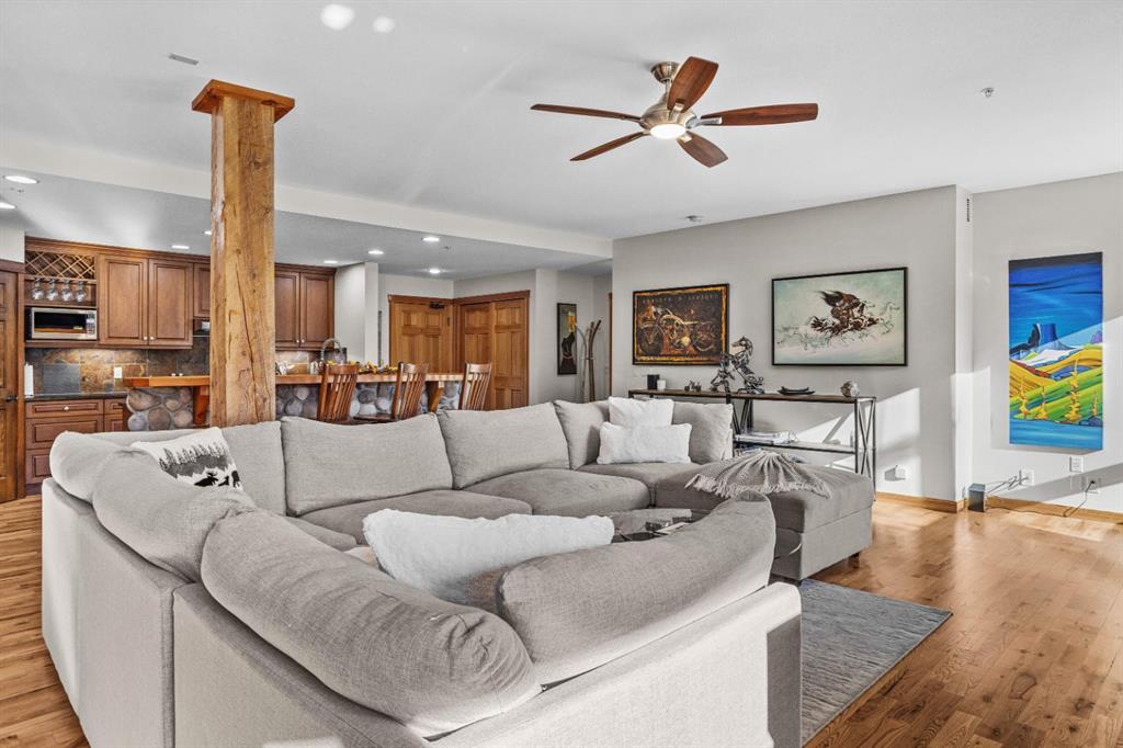 Experience the best of mountain living at this stunning 3-bedroom, 3-bathroom, single level condo in Trailside Lodges. Spanning over 2000SF, this property offers breathtaking, Southeast-facing mountain views, an abundance of natural light, and a seamless blend of comfort and style. You feel the warmth and spaciousness here from the moment you step inside this beautiful open-concept living area with floor-to-ceiling stone fireplace and beautiful hardwood flooring. The gourmet kitchen features high-end finishes, generous counter space, and lots of cupboards, ideal for culinary enthusiasts. The primary suite is a fabulous private retreat with space for a lounge area, direct deck access, and a large ensuite with a corner jetted tub, double vanity, spacious shower, water closet and walk-in closet. A second master suite also boasts direct deck access, a walk-in closet, and another elegant ensuite with double vanities. The third bedroom, tucked away for privacy, enjoys its own unique mountain views with a third full bathroom nearby. An oversized laundry room with additional flex space add to the home’s thoughtful design and offer tons of storage room. Enjoy outdoor living year-round on the impressive 35′ x 9′ partially covered deck, complete with a roll-down sunshade and patio heater, providing a comfortable space to take in the incredible mountain vistas. A number of recent upgrades have been completed, including new appliances, new kitchen sink/faucet, new toilets, & a murphy bed. Ownership at Trailside Lodges includes access to one of the best-outfitted clubhouses in Canmore, with hands down, the best outdoor hot tub with unbelievable panoramic views, an indoor resistance pool, a well-equipped fitness center, billiards & games loft, and a theatre room. Additional conveniences include a heated underground parking stall, storage for all your seasonal gear, and ample guest parking. This home is move-in ready and offers the perfect lock-and-leave lifestyle without compromising space or luxury.