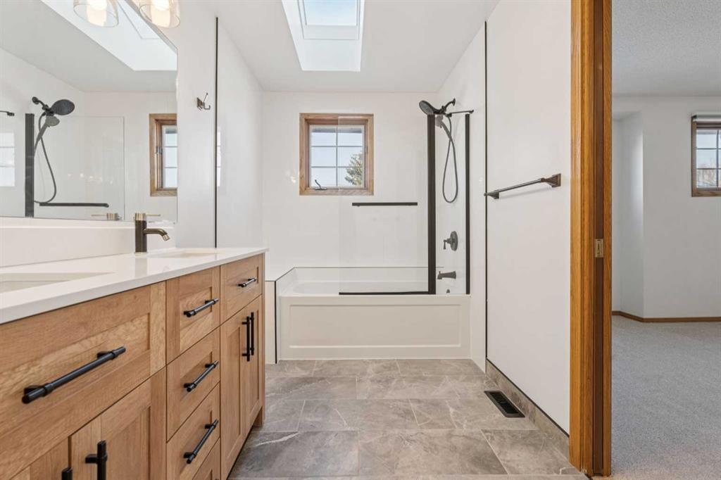 The upper level hosts the primary bedroom and additional bedrooms, highlighted by a beautifully remodeled primary ensuite featuring a double vanity, skylight, and a high-efficiency toilet, creating a bright, spa-like retreat. All bathrooms feature elegant tiled flooring and high-efficiency toilets.