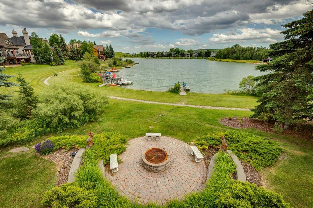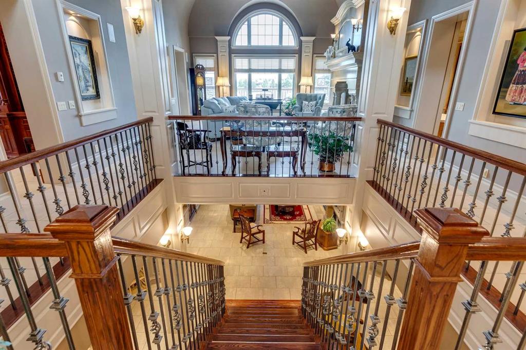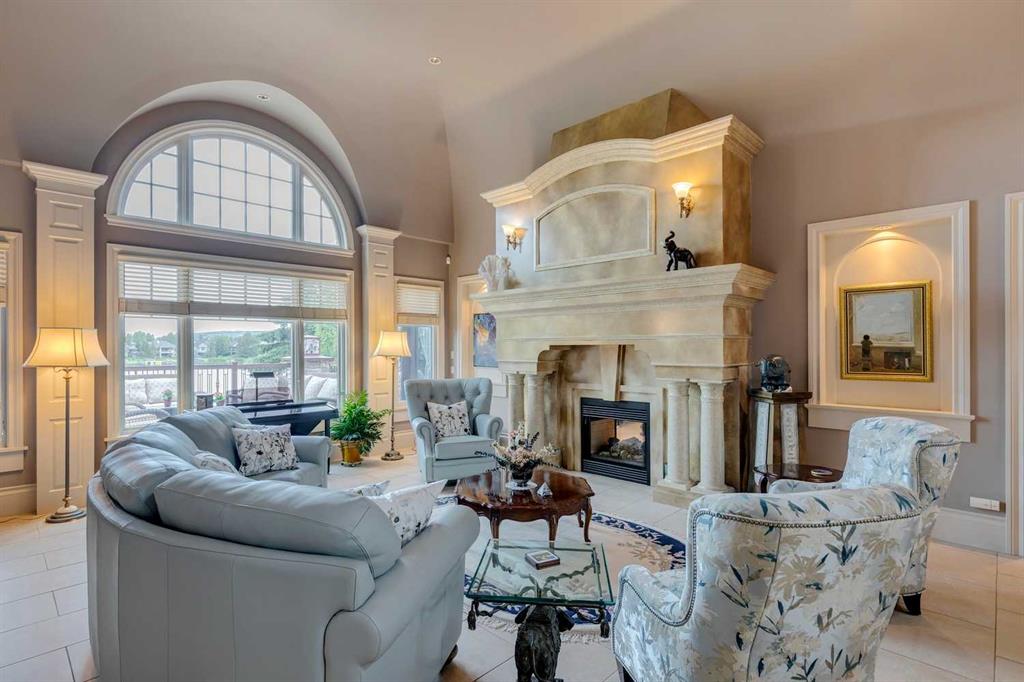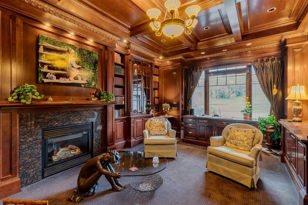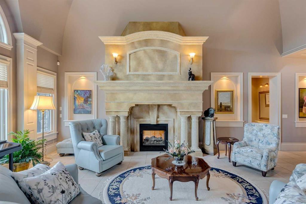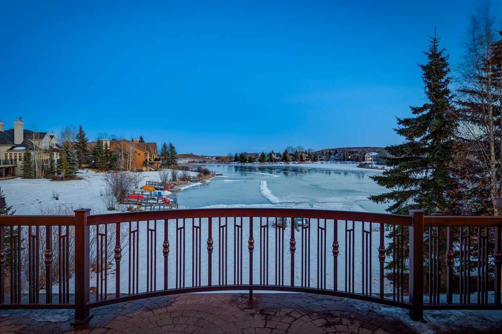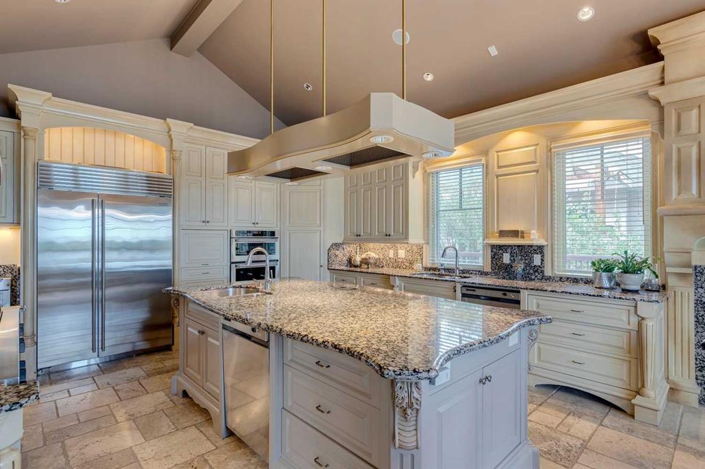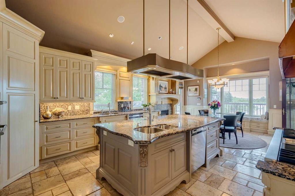 Discover one of the most iconic estate homes offered in prestigious Elbow Valley Estates—an extraordinary custom residence that combines European grandeur, architectural artistry, and exceptional craftsmanship. Perfectly positioned on a private lakefront lot, this executive walkout bungalow offers over 8000 square feet of exquisitely developed living space, designed with precision over years of thoughtful planning and executed by master artisans. From the moment you enter the grand foyer with its coffered and barrel-vaulted ceilings, it’s clear this is a home unlike any other. The main level features a sun-drenched great room with a double-sided fireplace and expansive windows framing unobstructed lake views. The heart of the home is the richly appointed ‘French Manor’ inspired kitchen—equipped for grand-scale entertaining with granite countertops, top-tier appliances including a Sub-Zero refrigerator, gas range with pot filler, two dishwashers, and a walk-in pantry. A cozy breakfast nook with fireplace and access to the expansive upper deck provides the perfect spot for morning coffee overlooking the water (with handi-cap access). An elegant formal dining room with custom glass cabinetry, a fully paneled library/office with fireplace, and a large laundry/sewing/hobby room complete the main level. A reverse osmosis water system is conveniently located in the craft room. The luxurious primary suite is a private sanctuary, featuring a vaulted sleeping area, two-way fireplace, and a spa-inspired circular ensuite with bubbling soaker tub, walk-in shower, dual vanities, and a generous dressing room with built-ins. The suite also offers deck access to enjoy tranquil lake views. A versatile loft functions as a full office or creative workspace, complete with multiple workstations—ideal for today’s remote professional or growing family. The lower level is designed for recreation and relaxation, boasting an authentic English-style pub with a full wet bar, games room, media/theatre room, and three additional spacious bedrooms—each with their own private ensuite and walk-in closet. Three solariums enhance the lower level, offering a fully enclosed hot tub retreat, home gym, and peaceful sitting room, all flooded with natural light. This remarkable residence is equipped with countless thoughtful upgrades, including two newer air conditioning units, newer hot water tank and sump pump, new sinks and hardware in the craft room and kitchen . The property also features a recently serviced irrigation system. Designed for effortless living, this home includes hydronic in-floor heating on all levels, a dramatic central staircase, private elevator, and a heated triple garage. Every detail reflects unparalleled quality and meticulous attention throughout. Outdoor living is equally exceptional, with sweeping views of the lake and beautifully landscaped grounds—an entertainer’s dream and a private oasis.