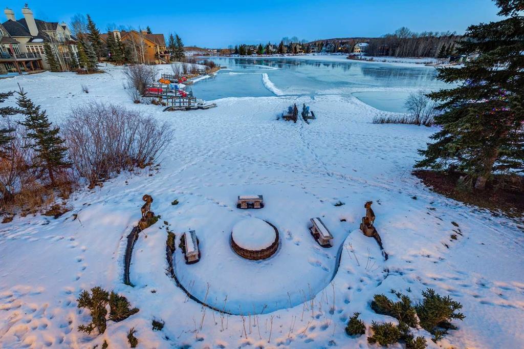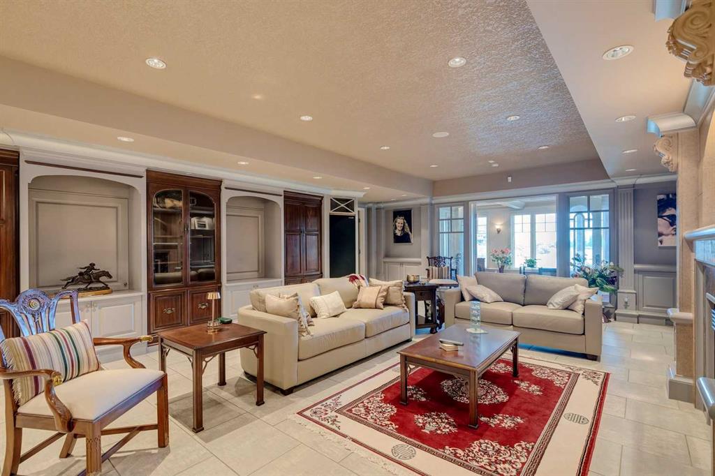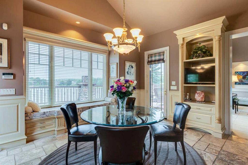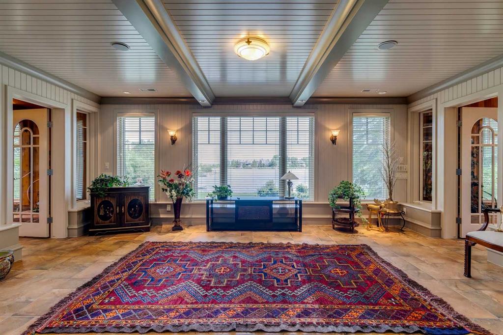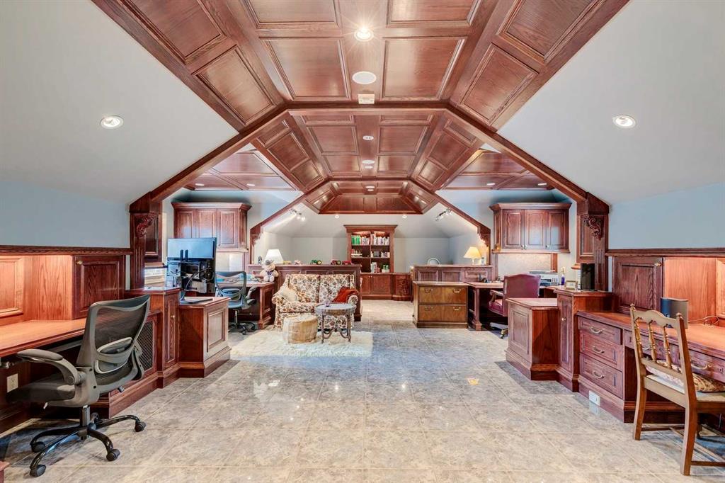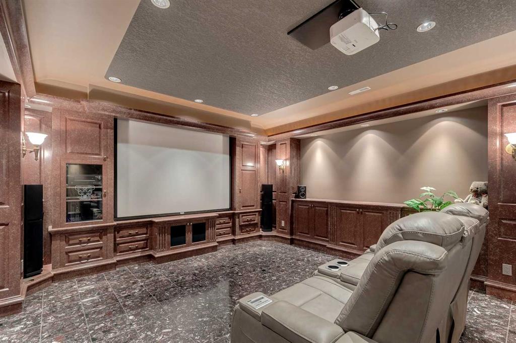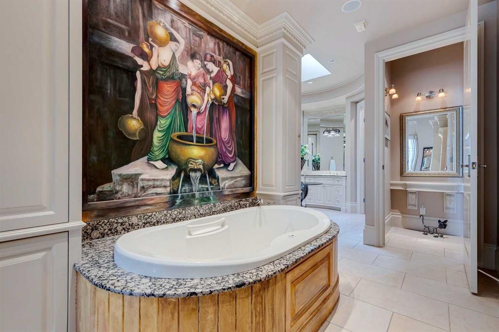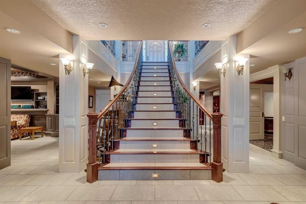 Discover one of the most iconic estate homes offered in prestigious Elbow Valley Estates—an extraordinary custom residence that combines European grandeur, architectural artistry, and exceptional craftsmanship. Perfectly positioned on a private lakefront lot, this executive walkout bungalow offers over 8000 square feet of exquisitely developed living space, designed with precision over years of thoughtful planning and executed by master artisans. From the moment you enter the grand foyer with its coffered and barrel-vaulted ceilings, it’s clear this is a home unlike any other. The main level features a sun-drenched great room with a double-sided fireplace and expansive windows framing unobstructed lake views. The heart of the home is the richly appointed ‘French Manor’ inspired kitchen—equipped for grand-scale entertaining with granite countertops, top-tier appliances including a Sub-Zero refrigerator, gas range with pot filler, two dishwashers, and a walk-in pantry. A cozy breakfast nook with fireplace and access to the expansive upper deck provides the perfect spot for morning coffee overlooking the water (with handi-cap access). An elegant formal dining room with custom glass cabinetry, a fully paneled library/office with fireplace, and a large laundry/sewing/hobby room complete the main level. A reverse osmosis water system is conveniently located in the craft room. The luxurious primary suite is a private sanctuary, featuring a vaulted sleeping area, two-way fireplace, and a spa-inspired circular ensuite with bubbling soaker tub, walk-in shower, dual vanities, and a generous dressing room with built-ins. The suite also offers deck access to enjoy tranquil lake views. A versatile loft functions as a full office or creative workspace, complete with multiple workstations—ideal for today’s remote professional or growing family. The lower level is designed for recreation and relaxation, boasting an authentic English-style pub with a full wet bar, games room, media/theatre room, and three additional spacious bedrooms—each with their own private ensuite and walk-in closet. Three solariums enhance the lower level, offering a fully enclosed hot tub retreat, home gym, and peaceful sitting room, all flooded with natural light. This remarkable residence is equipped with countless thoughtful upgrades, including two newer air conditioning units, newer hot water tank and sump pump, new sinks and hardware in the craft room and kitchen . The property also features a recently serviced irrigation system. Designed for effortless living, this home includes hydronic in-floor heating on all levels, a dramatic central staircase, private elevator, and a heated triple garage. Every detail reflects unparalleled quality and meticulous attention throughout. Outdoor living is equally exceptional, with sweeping views of the lake and beautifully landscaped grounds—an entertainer’s dream and a private oasis.