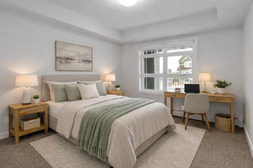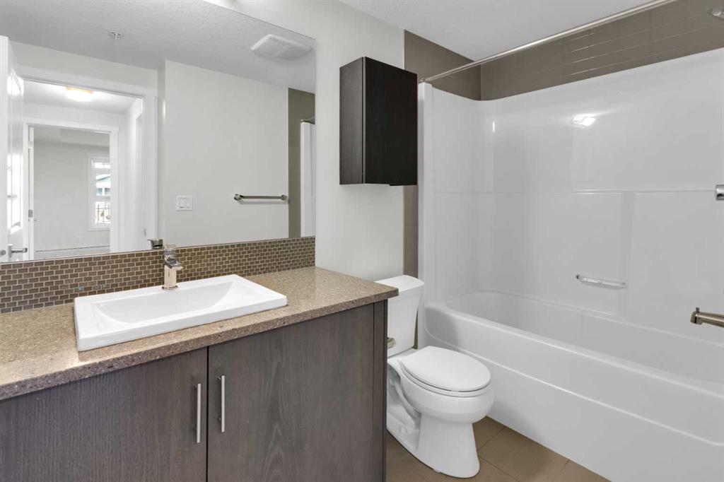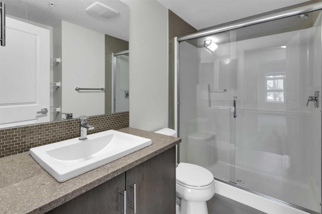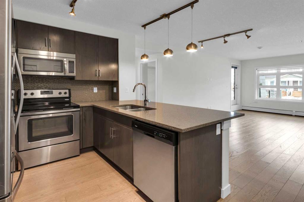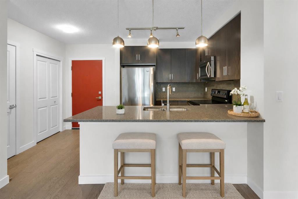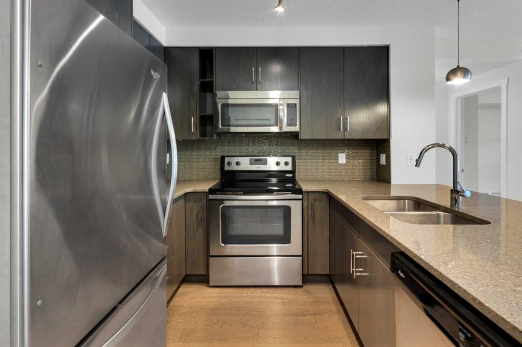 The open-concept layout features a modern kitchen with dark cabinetry, stainless steel appliances, tile backsplash, and granite countertops, along with a spacious peninsula with seating — perfect for everyday living or entertaining. The living area is filled with natural light and flows seamlessly to your private outdoor space. Durable laminate flooring runs throughout the main living areas, creating a clean and cohesive look, while both bathrooms feature tile flooring for added durability and style. The primary bedroom includes a walk-through closet and private 4-piece ensuite. The second bedroom is thoughtfully positioned on the opposite side of the unit, ideal for guests, a roommate, or a home office. A second full bathroom and in-suite laundry complete the interior. This unit also includes one titled underground parking stall and assigned storage for added convenience. Located just steps from shopping, restaurants, transit, and with full access to Auburn Bay Lake amenities, this is an excellent opportunity for first-time buyers, investors, or those looking to downsize.