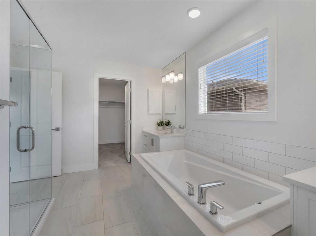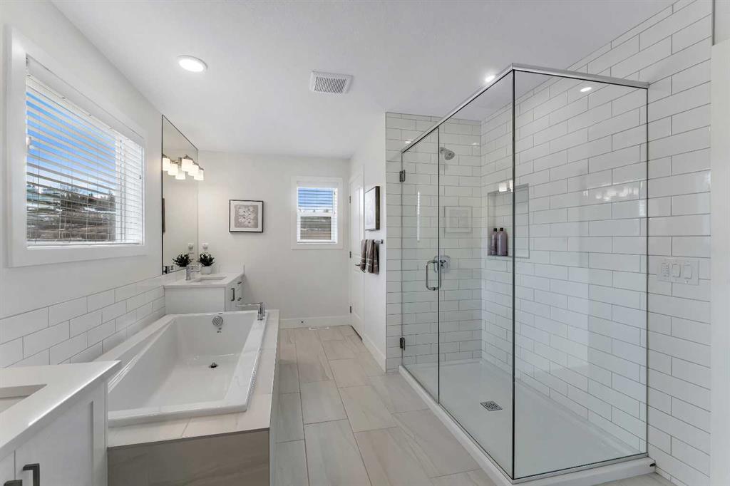 Upstairs features a spacious BONUS ROOM, three good-sized bedrooms, a main bathroom with DUAL vanities, and a primary ensuite for a quiet retreat. The primary quarters are positioned at the rear of the home to capture the views and includes an upgraded ensuite with split vanities, glass shower, and a soaker tub with tile surround. The layout is ideal for growing families, balancing privacy and functionality.