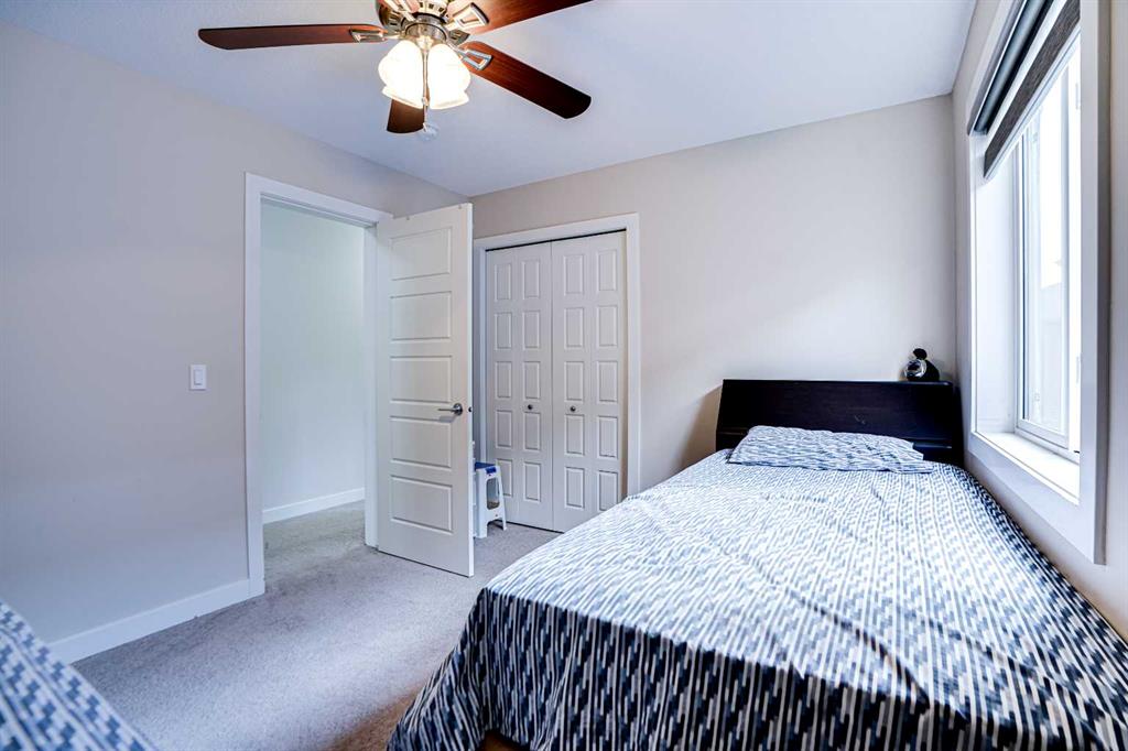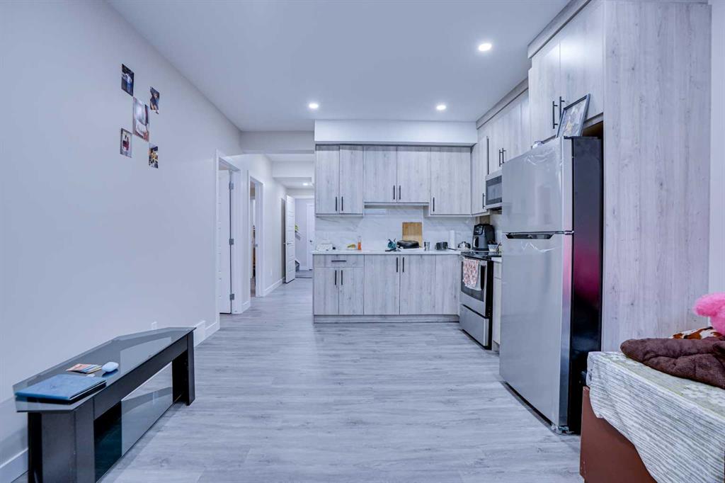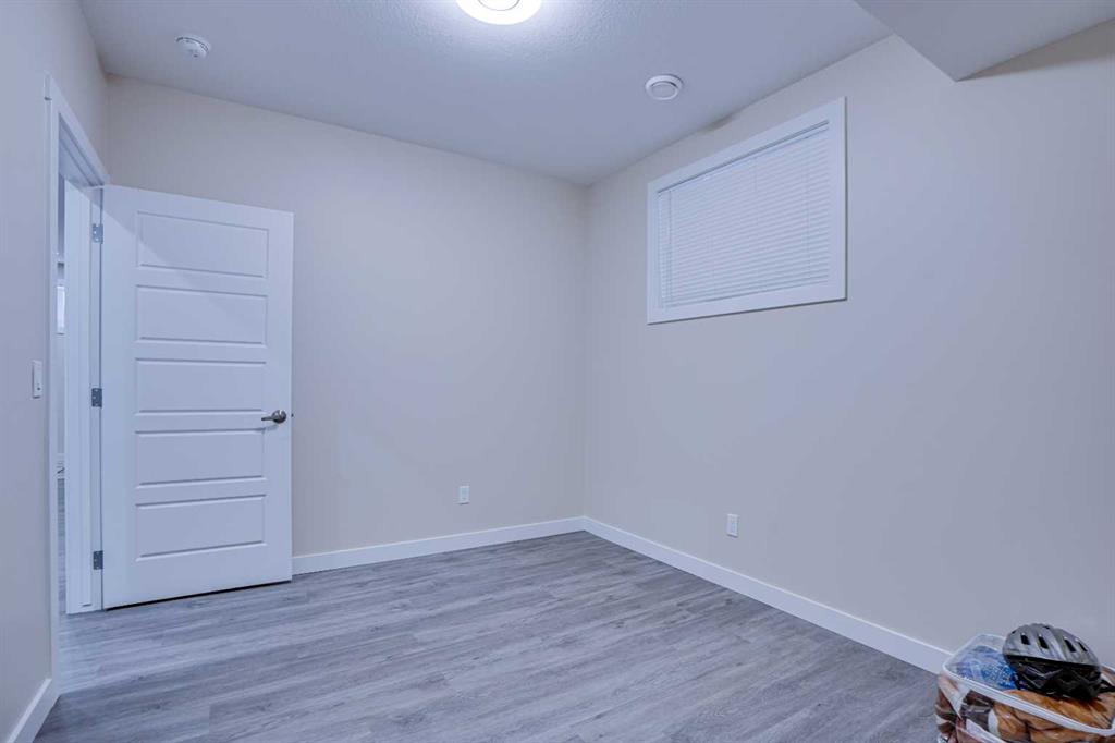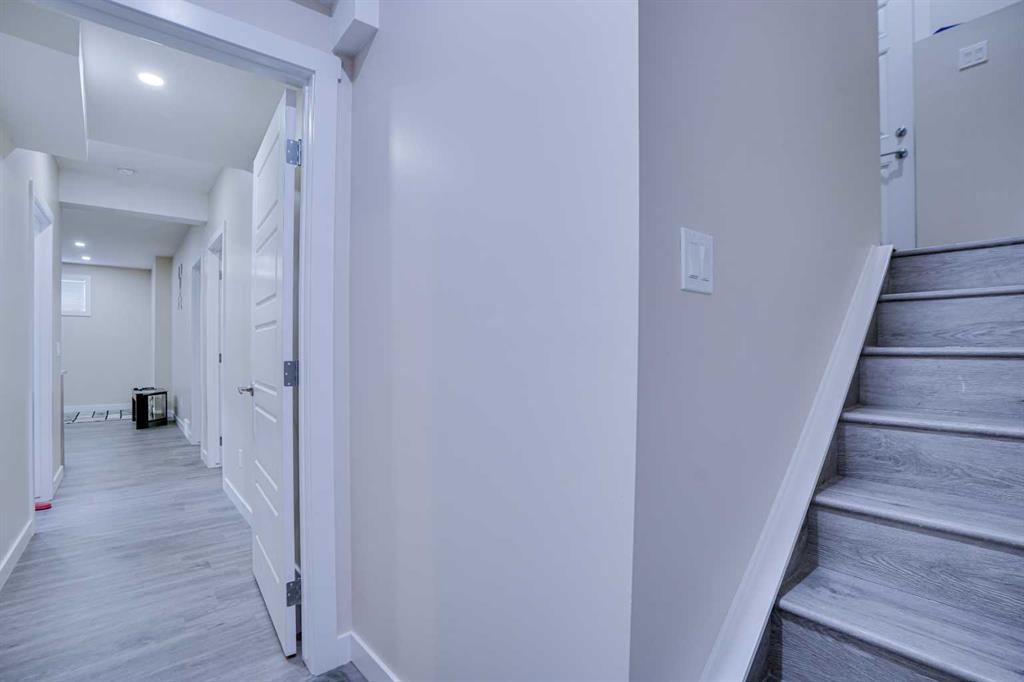 Downstairs, the 2-bedroom basement suite (illegal) includes a separate exterior entrance, 9-foot ceilings, an open living area, its own laundry, and extra storage. The basement kitchen features full-height cabinetry, quartz countertops, stainless steel appliances, and a double sink. Two generous bedrooms share a 3-piece bathroom with a walk-in shower, creating a comfortable and independent space.