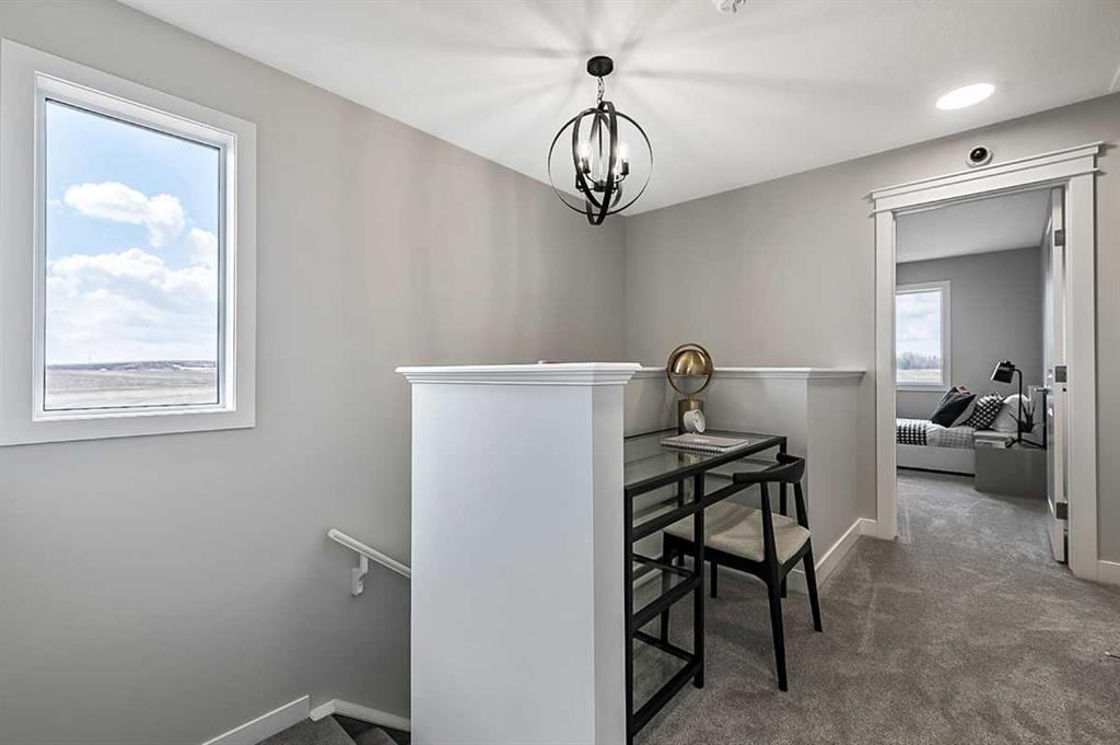 This 1,700 sq ft townhome in Vermilion Hill offers a balanced combination of space, function, and location. Designed with modern finishes and a double detached garage, the home features an open-concept main floor with high ceilings and large windows for natural light. The entryway includes built-in storage and connects to a kitchen equipped with stainless steel appliances, quartz countertops, and a central island. The upper level includes a primary bedroom with a walk-in closet and ensuite, two additional bedrooms, and a loft providing flexible living options. The property is situated approximately 20 minutes from downtown Calgary and within minutes of major amenities such as Costco. Mountain and downtown views contribute to the appeal of the area, which is known for its accessibility and new community design. Renderings and photos are representative.